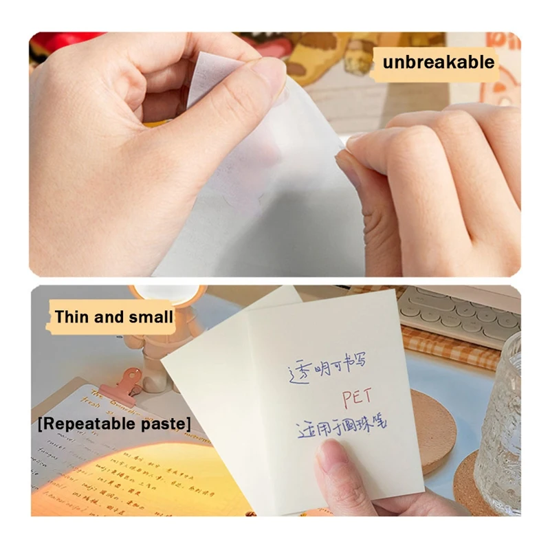 Selección de materiales PET de alta calidad: las notas adhesivas translúcidas están hechas de PET no tóxico de gran calidad, que tiene buena transparencia y es resistente al agua.Los adhesivos son fáciles de aplicar y quitar sin dejar marcas de pegamento.