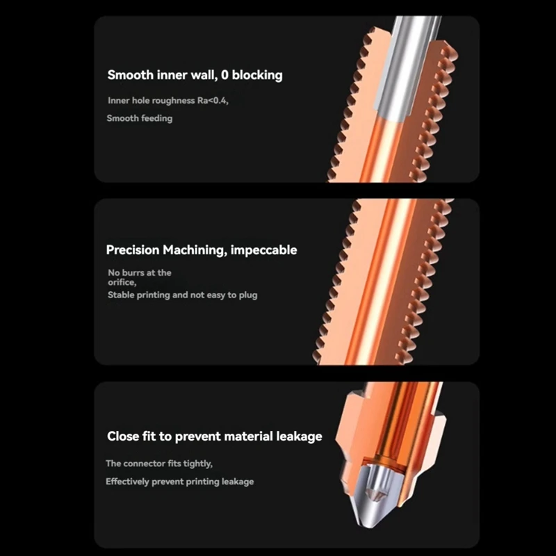 [Fácil de instalar] La boquilla y la rotura de calor adoptan un diseño integrado totalmente metálico, lo que facilita un desmontaje rápido y un reemplazo conveniente. Paredes interiores lisas y sin obstrucciones, rugosidad del agujero interior RaLess 0,4, asegurando una alimentación suave del filamento.
