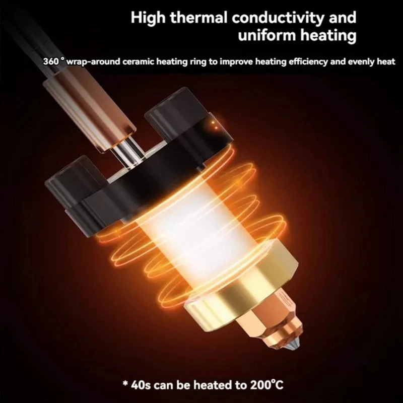 [Alta velocidad, alto flujo]-Gracias a la ampliación de la longitud de la sección de fusión en caliente, Creality K1C hotend admite 600 mm/s de alta velocidad y 32mm & sup3;/s de impresión de alto flujo. Además, el calentador de cerámica envolvente de 360 ° mejora la eficiencia de calentamiento y un calentamiento más uniforme. Se puede calentar a 200 ℃ en 40 segundos.