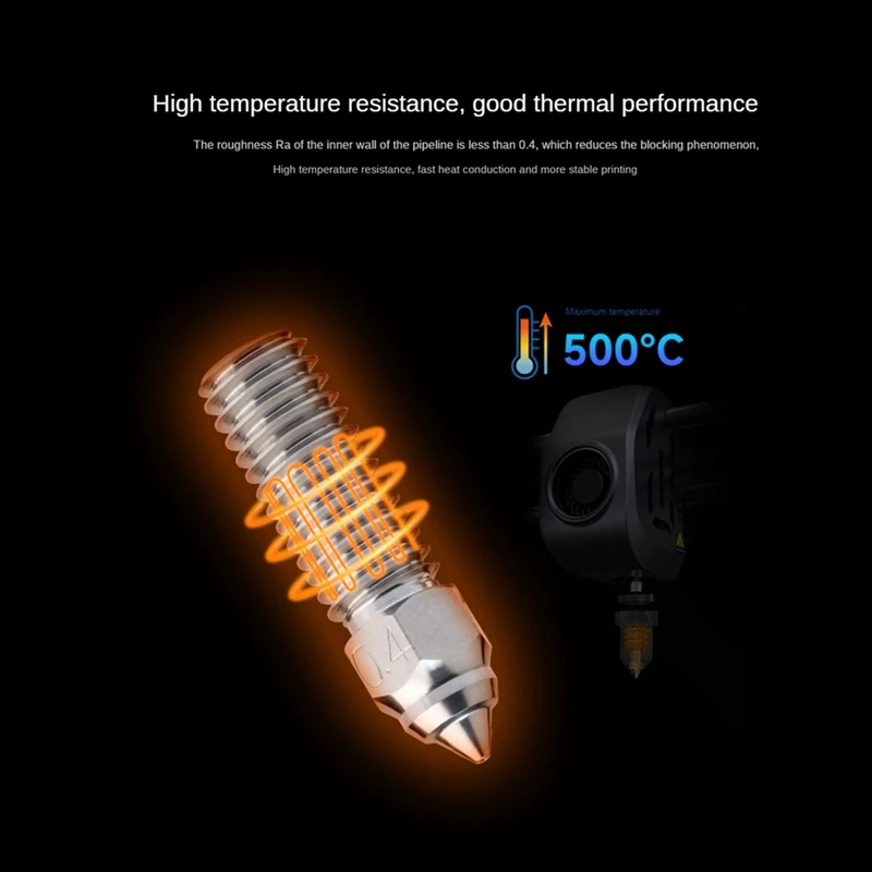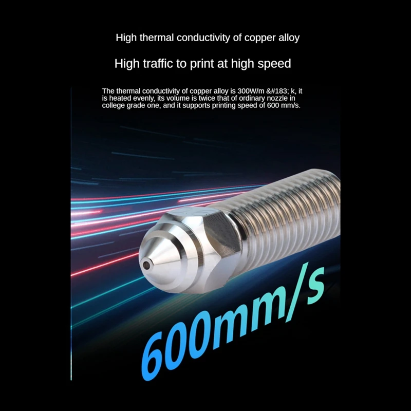 Aleación de cobre con alta conductividad térmica Alto flujo para impresión de alta velocidad: La conductividad térmica de la aleación de cobre es tan alta como 330 W/m · K, lo que garantiza que la boquilla se caliente de manera uniforme. El volumen es dos veces más grande que las boquillas normales, soportando una velocidad de impresión de alta velocidad de 600mm.