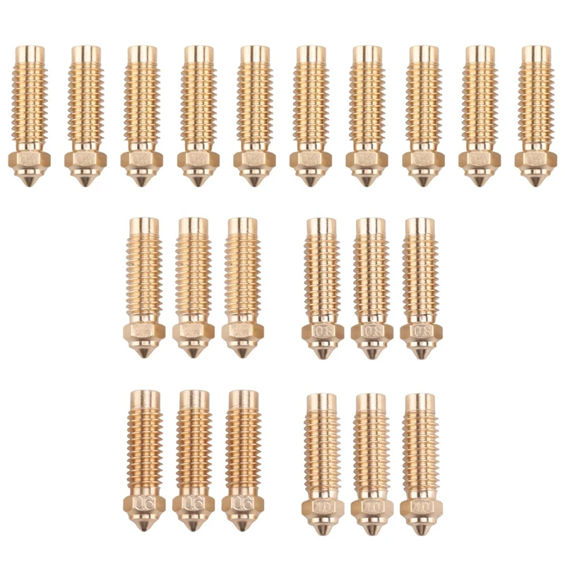 El paquete incluye: 22 boquillas de latón (10 piezas 0,4 mm, 3 piezas 0,2 mm, 3 piezas 0,6 mm, 3 piezas 0,8 mm, 3 piezas 1,0 mm).