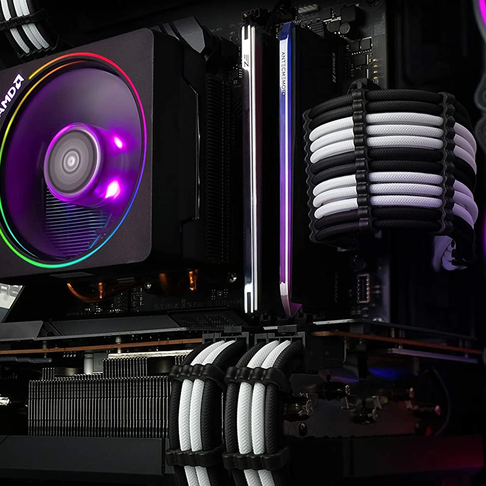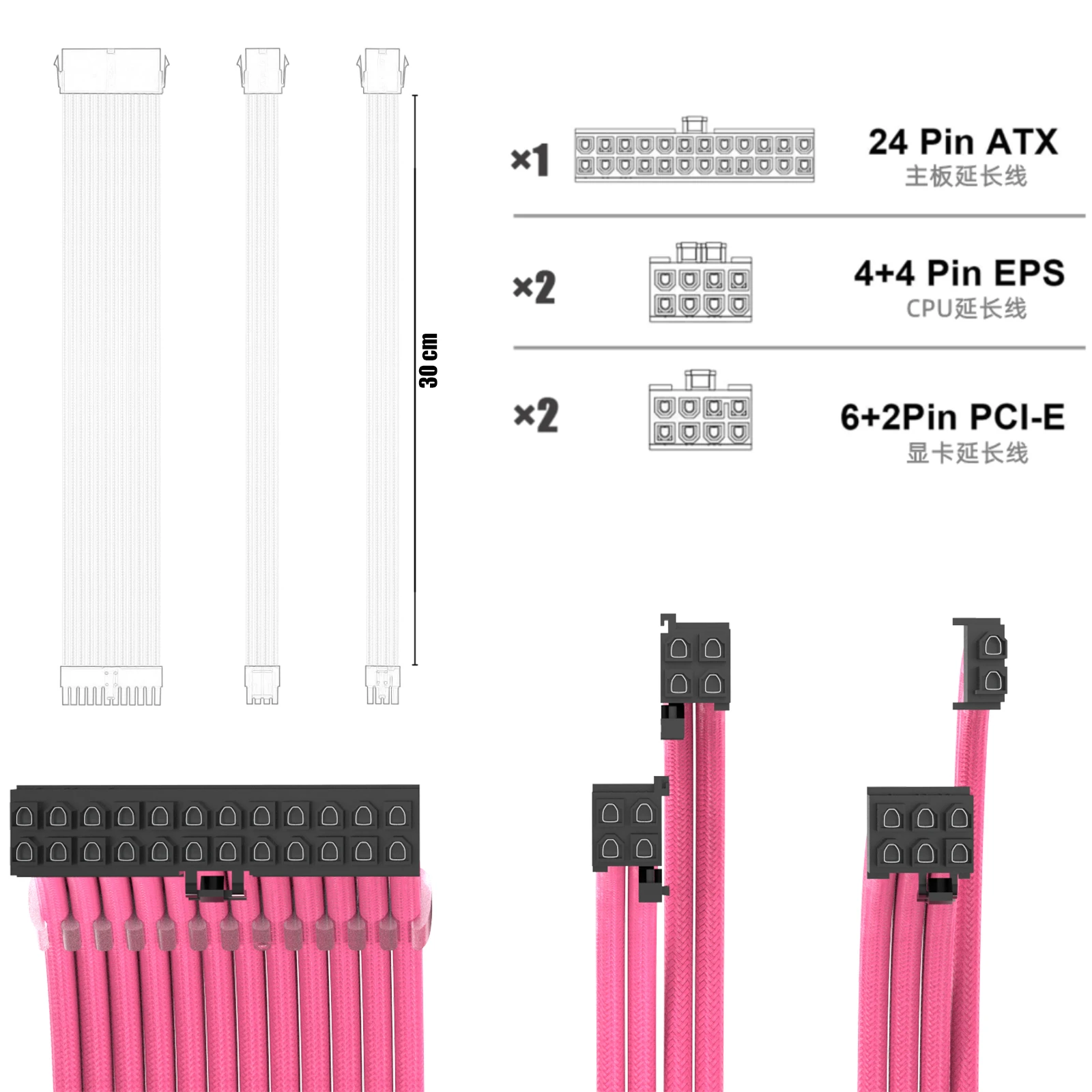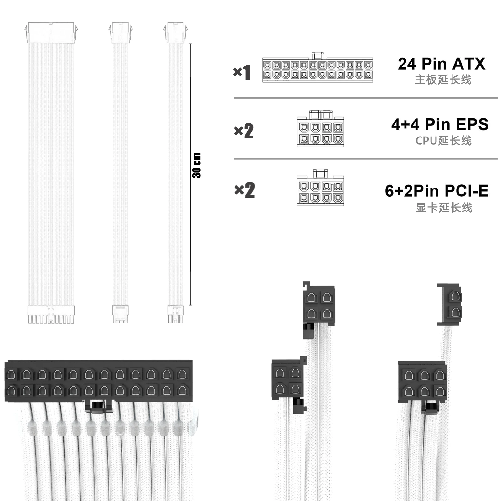 Kit de cable de extensión PCI-E ATX de 18AWG, cable de alimentación de extensión PSU con funda hembra a macho de 24 pines/EPS 4 + 4 pines/PCI-E de 8 pines