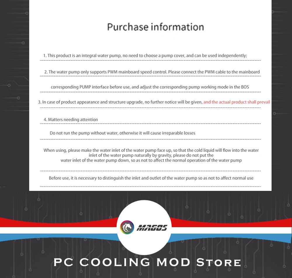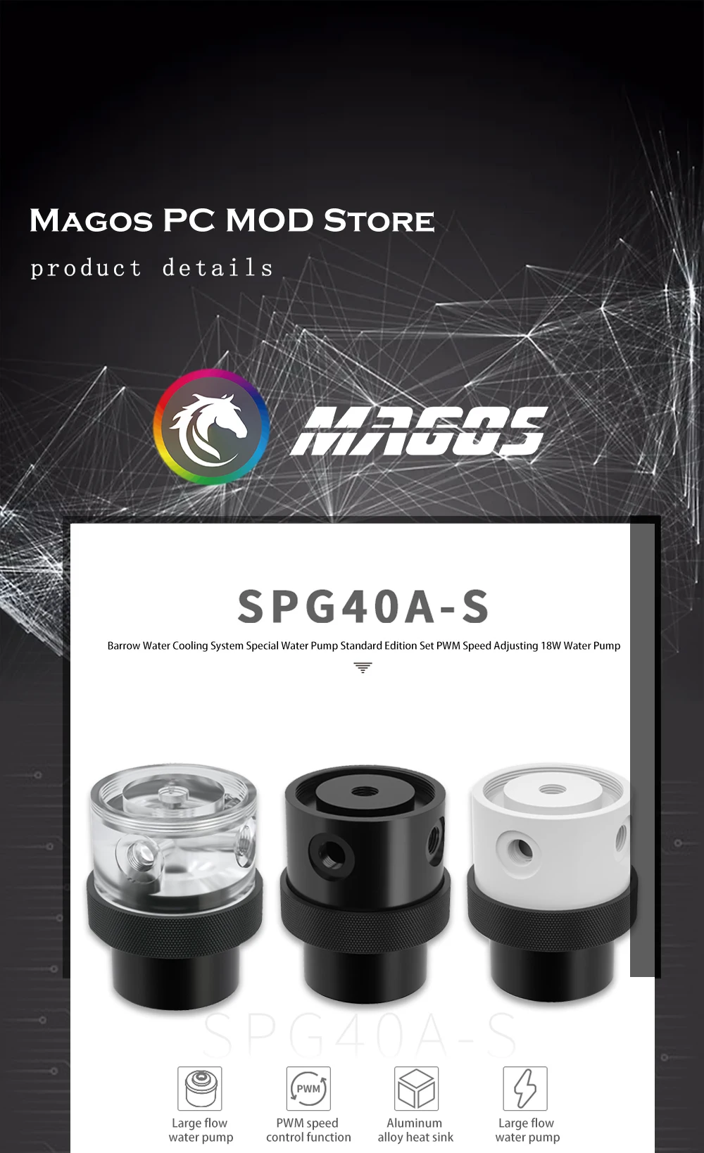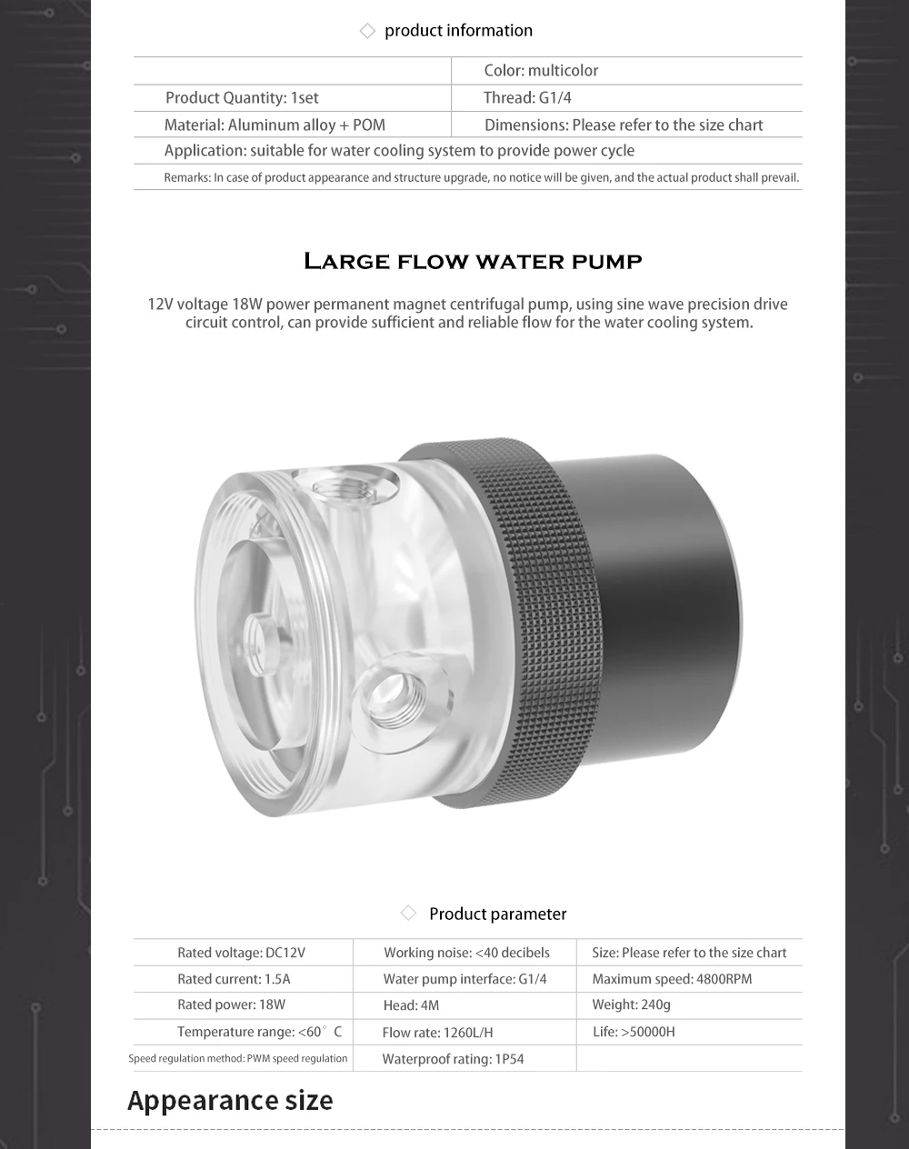 Diseñado para el sistema de refrigeración por agua, puede proporcionar suficiente potencia circulatoria para el sistema y mantener un estado de funcionamiento estable a largo plazo Nota: Se puede utilizar de forma independiente, incluyendo el núcleo de la bomba, la cubierta de la bomba y la carcasa de aleación de aluminio de media cubierta, por lo que se puede utilizar de forma independiente. Hay una variedad de opciones de combinación de colores, consulte el Servicio de Atención al Cliente específicoModelo: SPG40A-S Interfaz de señal: 4 pines grandes + control de velocidad automático PWM + retroalimentación de datos Tipo de bomba: bomba síncrona de imán permanente Tecnología de accionamiento: cuatro PCB, todo de estado sólido Velocidad de carga: Max4800rpm Consumo de energía de voltaje: TOP18W DC12V Rango de voltaje: 8V-16V Cabezal de salida: 4 metros Flujo máximo: 1260L/H Temperatura de funcionamiento: 38 grados por debajo de 4000rpm Material de la cubierta de la bomba: POM/PMMA Material de la carcasa del radiador: aleación de aluminio Servicio de Atención al Cliente: reemplazo gratuito por fallos no humanos dentro de 1 año (no dañe la cubierta de la bomba en las etiquetas de garantía, ya que si se daña perderá el servicio de garantía)