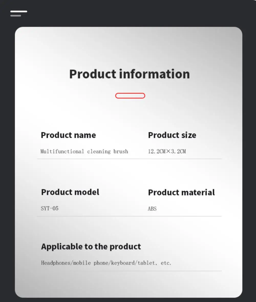 Material del producto: ABS + material de carcasa de PC + Punta de pluma de acero inoxidable + esponja de felpa + cepillo PBT