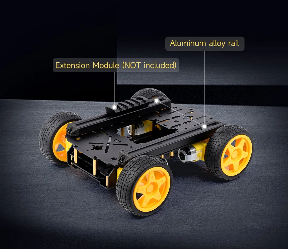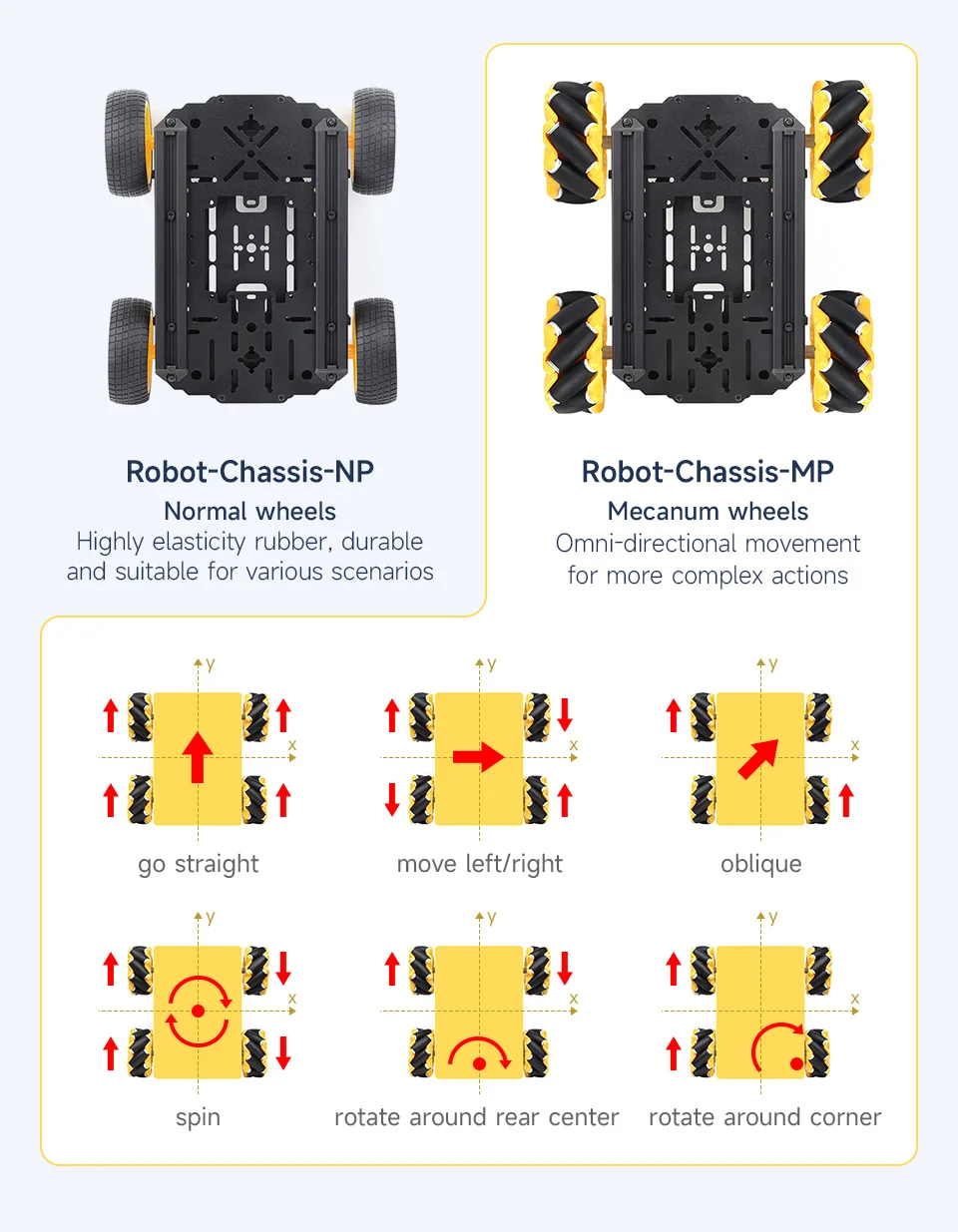 Nota: El controlador general para robots es adecuado para Robot-Chassis-NP y Robot-Chassis-NS, ya que esta placa controladora solo puede controlar dos grupos de motores al mismo tiempo, mientras que el chasis del robot con rueda Mecanum requiere cuatro motores para funcionar por separado.