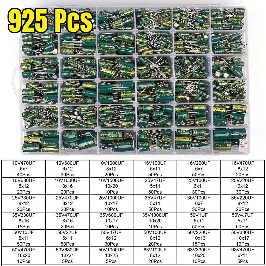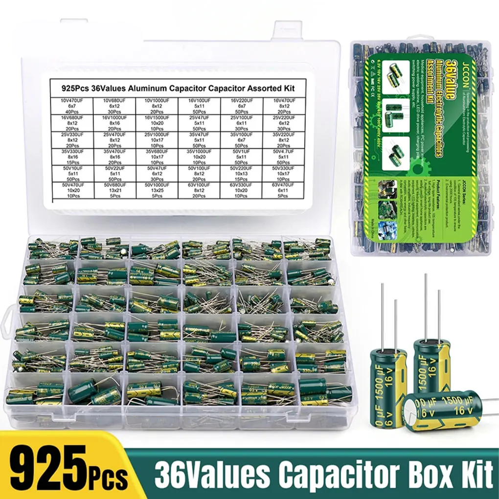Comprar Kit de condensador electrolítico de aluminio duradero, condensador bajo ESR de 36 valores, surtido de aluminio ancho de 16V-50V, 1uF-925 uF, 470 piezas