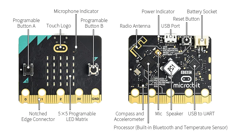 Puede utilizar su BBC micro:bit para todo tipo de creaciones interesantes, desde robots hasta instrumentos musicales, las posibilidades son infinitas.Este pequeño dispositivo tiene muchas funciones, como 25 luces LED rojas que pueden hacer parpadear mensajes.Hay dos botones programables que se pueden usar para controlar juegos o pausar y saltar canciones en una lista de reproducción.Su BBC micro:bit puede detectar movimiento y decirle en qué dirección se dirige, y puede usar una conexión Bluetooth de bajo consumo de energía para interactuar con otros dispositivos y Internet.