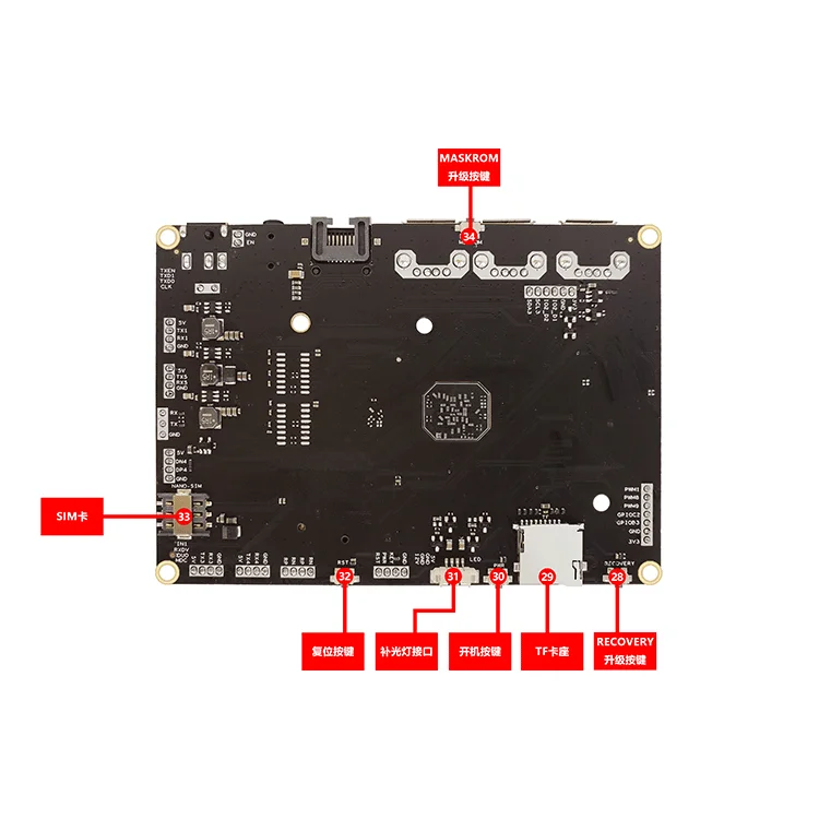 USB interface 4 USB, 3 standard A port (one OTG), 1 internal plug-in UART serial port 5 TTL 3.3V levels (add chip RS232), one of which is Debug PWM interface 3-channel PWM 3.3V level SDIO interface 2 SDIO interfaces, one TF card, the other connects to WIFI GPIO interface 9 channels available GPIO ADC interface 2-way ADC interface I2C interface 2-way I2C interface MIPI DSI display 1 channel maximum 1920x1080 60fps Camera interface 2 mipi csi camera input Fill light 2 channels of controllable fill light, 1 channel is infrared light, 1 channel is white light Voice input 1 way silicon microphone input, the other way LANE IN input Voice output 1 channel left and right channel output, 5W power amplifier connected to the bottom board WIFI Support dual frequency 2.4G/5G AP6256 Bluetooth Support Bluetooth 5.0, support BLE mode Ethernet The default connection to RGMII 100/1000M PHY RTL8211F chip 4G Support 4G full Netcom module pcie interface Output power Multi-channel power output 3.3V 5V 12V System Upgrade Support local USB upgrade RTC Button battery interface
