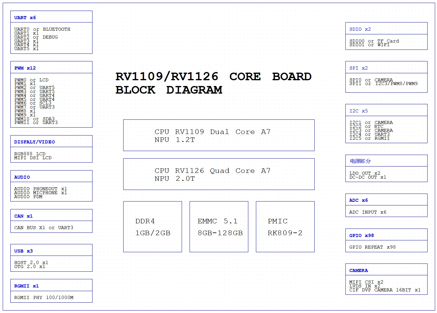 buildroot 5.9 Hardware function RTC time saving HY8563 √ Reset button √ Burning chain √ Function key ADC0 √ USB OTG device mode ADB √ USB OTG HOST mode √ USB HOST interface √ TF card max 128GB √ Debug serial port 2 √ 4 functional serial ports 1, 3, 4, 5 √ 5 channels controllable GPIO √ 5-channel ADC interface √ MIPI camera interface IMX307 √ MIPI binocular camera GC2093+GC2093 √ MIPI binocular camera GC2053+OV2718 √ USB camera YVC √ MIPI display + touch screen up to 1920x1080 √ Headphone output √ Speaker output (with headphone detection function) √ LANE IN Two-channel voice input √ PDM digital silicon microphone √ SDIO wifi AP6256 5G dual frequency √ BT Bluetooth 5.0+BLE √ Gigabit Ethernet RTL8211F adaptive 100/1000M √ 4G communication EC20 √ Restore factory settings √ USB to serial port √ USB to network port √ Driver list rk809-2 PMIC driver √ Ethernet RTL8211F driver √ SDIO WIFI+BT AP6256 driver √ UART serial port driver √ MIPI display driver √ I2C touch screen driver √ RTC time saving drive √ EC20 drive √ SPI driver √ ADC drive √ I2C driver √ PWM drive √ SDIO driver √ GPIO drive √ USB drive √