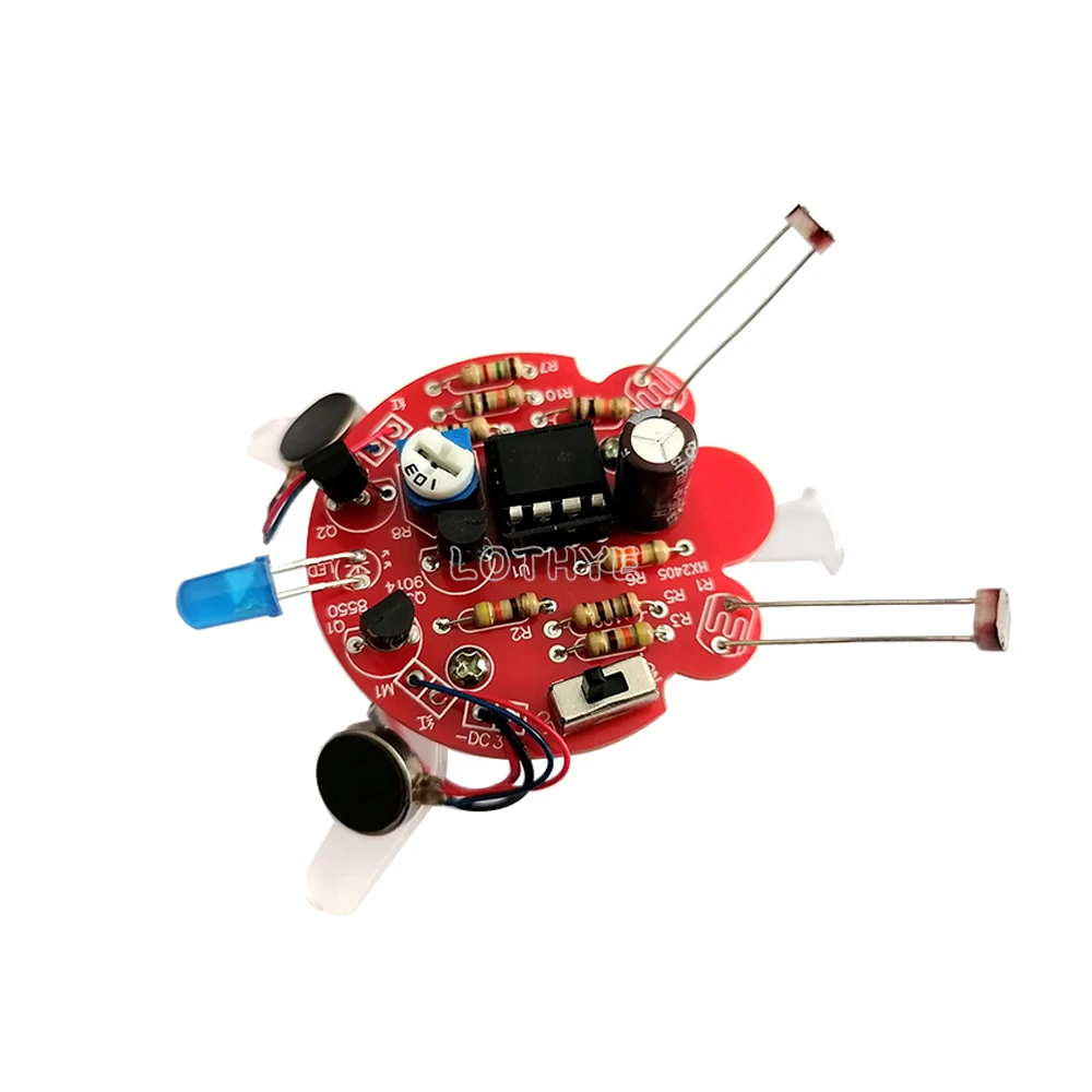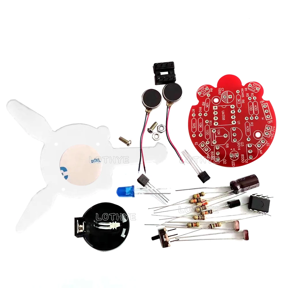Nombre del producto: Kit de robot de luciérnaga fotosensible. Voltaje de funcionamiento: DC3V (pila de botón CR2032). de la placa Tamaño: 40*43mm. Sensor: fotorresistencia. Movimiento fotosensible:. Las antenas de la cabeza de la luciérnaga pueden detectar la presencia de luz. Cuando la luz brilla en las antenas izquierda y derecha R1 o R4, el transistor Q1 o Q2 conduce y el motor correspondiente instalado en las patas comienza a vibrar. La luciérnaga se moverá en la dirección de la luz sensible. Lámpara de respiración trasera: el circuito de la lámpara de respiración se compone de un amplificador operacional LM358 IC, que simula el efecto luminoso de las luciérnagas que se encienden y apagan en entornos oscuros. Los productos son adecuados para que los entusiastas de la electrónica estudien y reparen circuitos. Solo garantizamos que los productos están en buenas condiciones antes de la entrega y no podemos garantizar el 100% de éxito después de la instalación. La Instalación del circuito requiere que el comprador tenga experiencia en el circuito, lea atentamente la descripción del producto antes del pago. Este Kit no incluye pilas