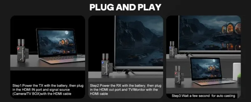 -Plug and play.Los transmisores y receptores están emparejados de fábrica, lo que le permite conectar y utilizar el producto tan pronto como lo reciba.No es necesario utilizar ninguna configuración de aplicación o programa.(Nota: Cada nuevo receptor debe emparejarse de acuerdo con el manual de instrucciones, muy simple)