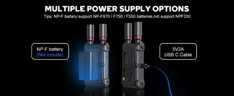 -Múltiples opciones de fuente de alimentación.El producto admite tres métodos de suministro de energía: alimentación móvil, alimentación tipo C de 5 V/2 A; Batería externa NP-F970/750/550 (Nota: la batería no está incluida).Lo hace más cómodo y fácil de usar cuando estás fuera de casa.
