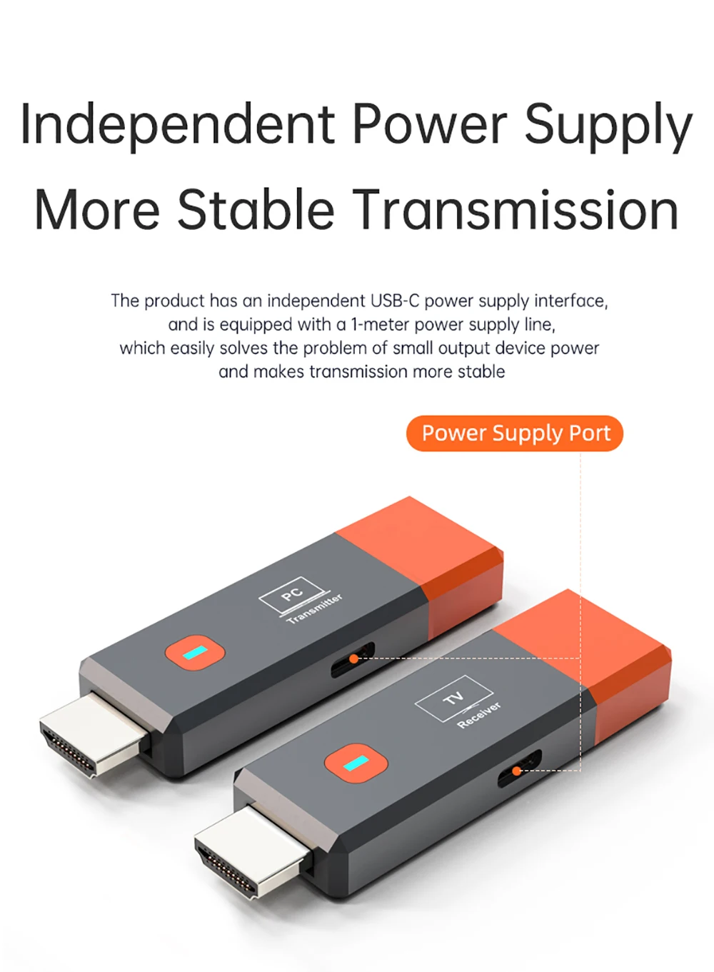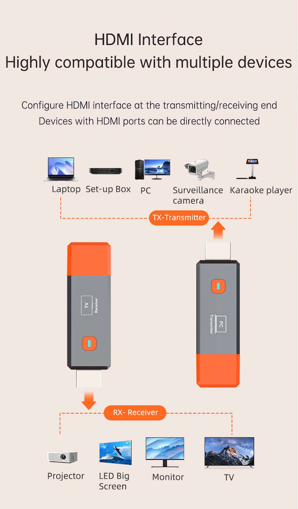 La interfaz HDMI es altamente compatible y puede ser convertible a otras interfaces.El dispositivo con interfaz HDMI se puede utilizar directamente y el dispositivo sin interfaz HDMI se puede utilizar con un convertidor HDMI.Transmita de forma inalámbrica video 3D y audio digital de alta definición de 1080p verdaderos a su televisor o proyector.Mire películas y programas de televisión desde su computadora portátil, PC, MacBook, iPad Pro, receptor A/V, consola de juegos, PS4/5, Xbox, Nintendo Switch, cable/satélite