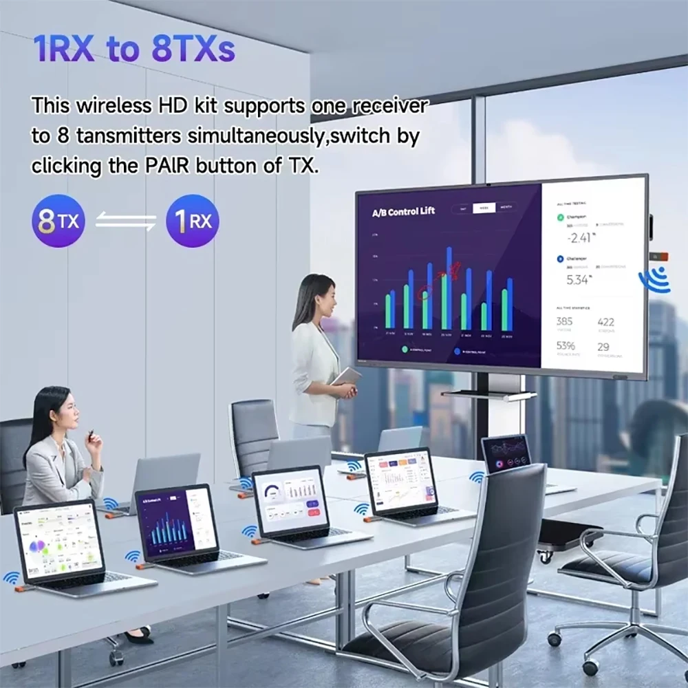 Se pueden conectar 8 transmisores a 1 receptor al mismo tiempo, interruptor con un clic, no interfiere entre sí y se pueden compartir varias pantallas.*Nota: Esta operación requiere la compra adicional de transmisores y los 1 receptor pueden admitir hasta 8 transmisores.