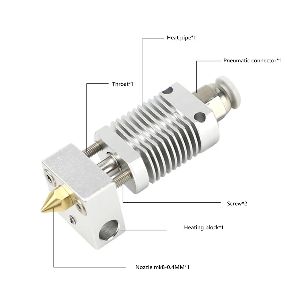 Especificación: Modelos aplicables: Para Creality/CR10S/Ender 3/Ender 5, etc. Color: Oro, plata (opcional) Material: aleación de aluminio, acero inoxidable y latón Tipo de instalación: Conexión de rosca externa Tamaño: Tamaño de la boquilla: 0,4mm Longitud de garganta: 30mm Tamaño del bloque de aluminio: 20x20x10mm Peso: 30g