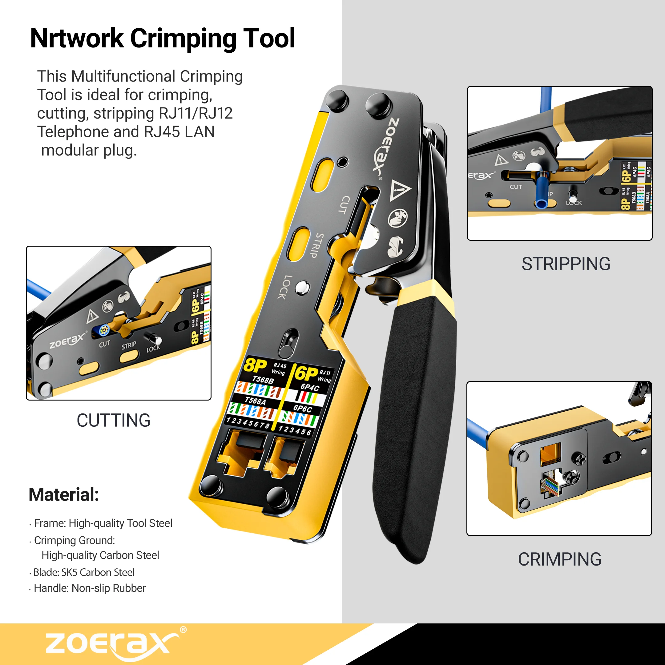 Equipado con pelacables coaxiales, pelacables redondos, cortadores y pelacables planos; los cortadores de cables pueden cortar fácilmente el cable Ethernet.