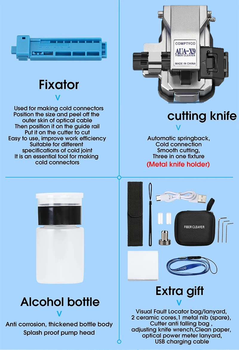 Kit de herramientas de fibra óptica con cuchilla de fibra AUA-X9-70 + 10dBm/-50 + 26dBm 3 en 1 Mini medidor de potencia óptica 10Mw Localizador Visual de fallas