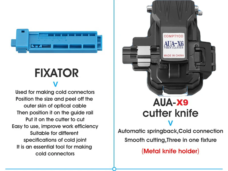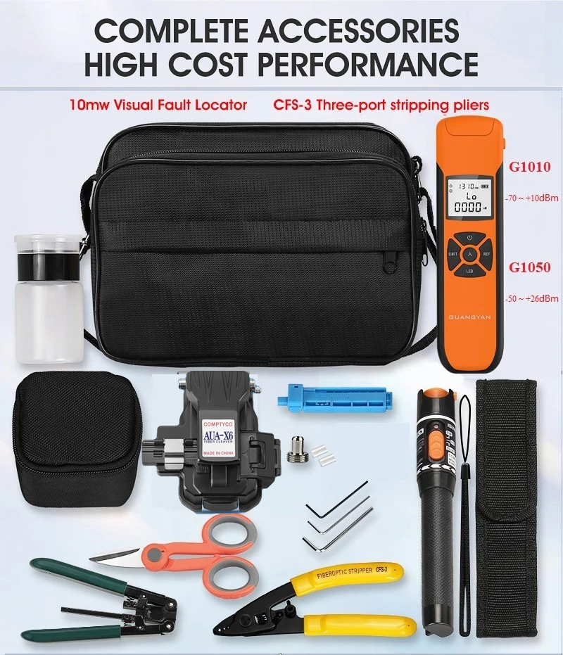 Comprar Kit de herramientas de fibra óptica FTTH con cuchilla de fibra AUA-X6-70 ~ + 10dBm/-50 ~ + 26dBm G10 medidor de potencia óptica 10mw Localizador Visual de fallas
