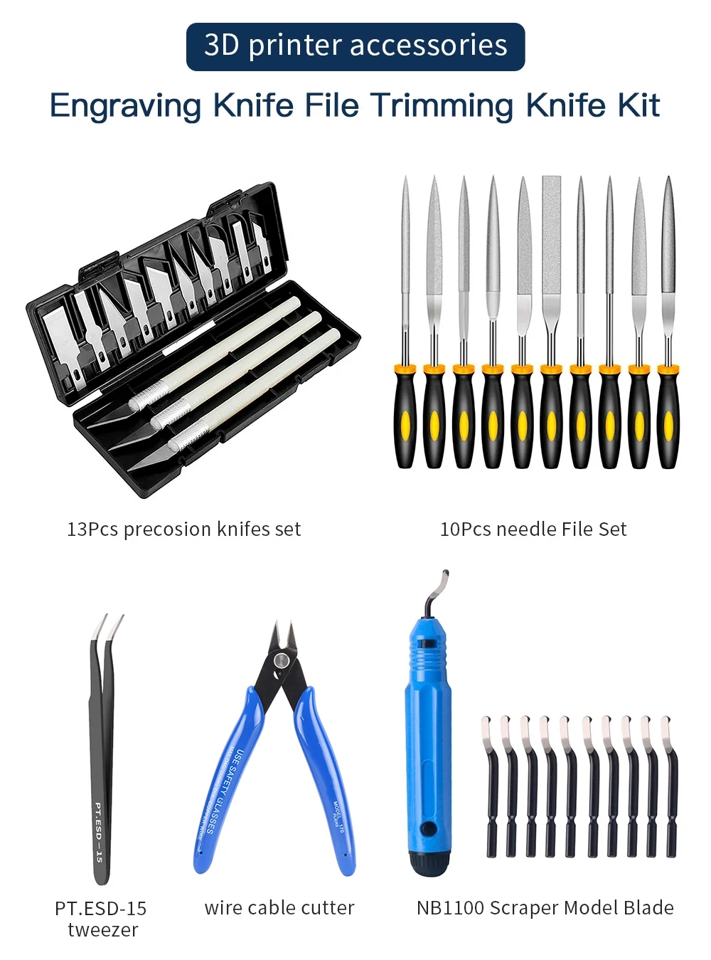 Pretty light aluminum alloy handle knife with anti-slip design. Sharper and more durable alloy steel blades. Snap-fitted top of the engraving knife, and the blade can be replaced by loosening the buckle. Everything needed to print, maintain and clean up 3D Models.