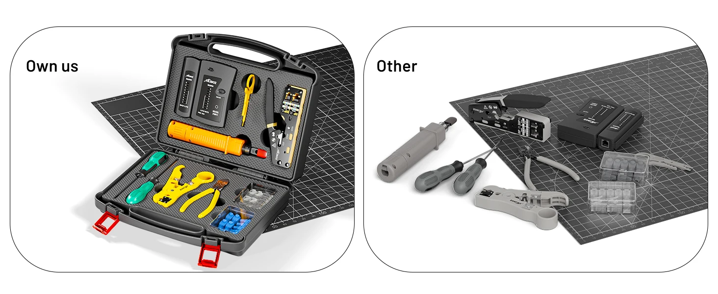 【Accesorios y más】 El kit también incluye 10 conectores de paso Cat6 de con 10 fundas de RJ45, 1 mini cortadores y 2 cuchillas de repuesto. Todas las herramientas se mantienen ordenadas y organizadas con almohadillas de burbujas de plástico en un estuche de aspecto profesional.