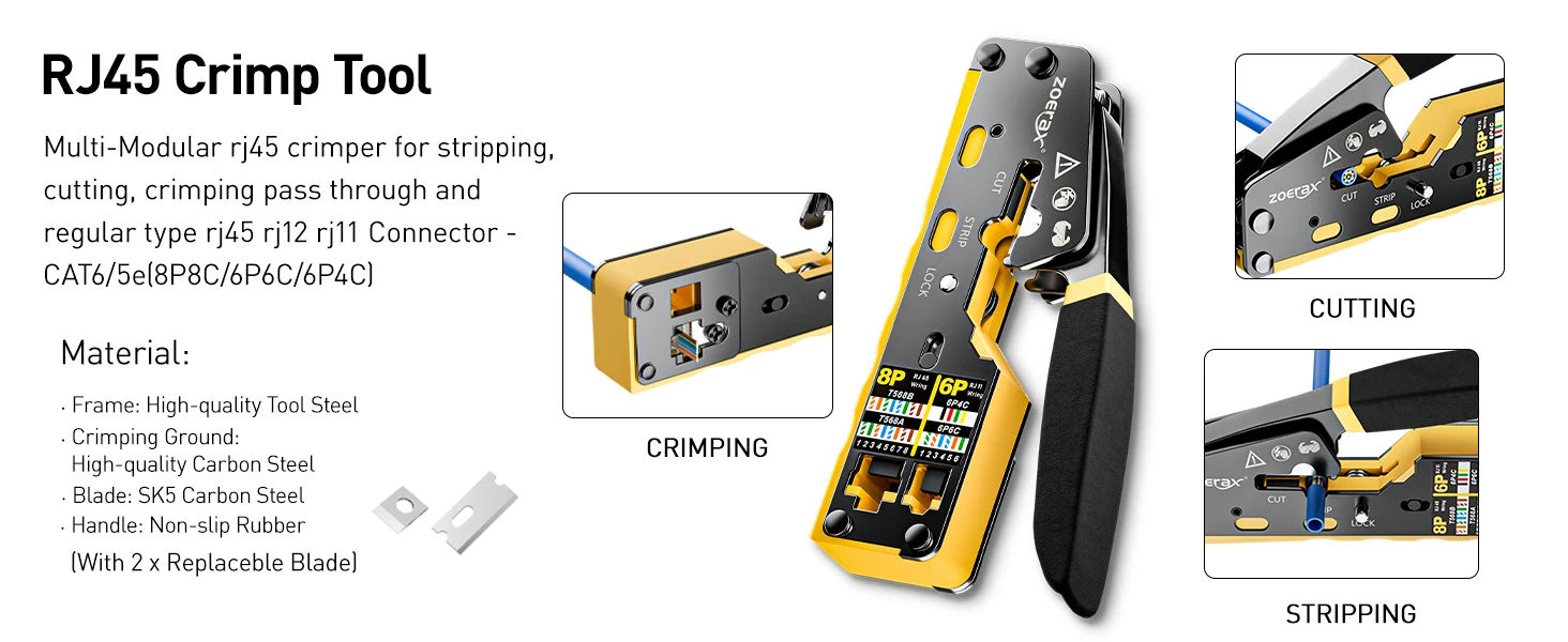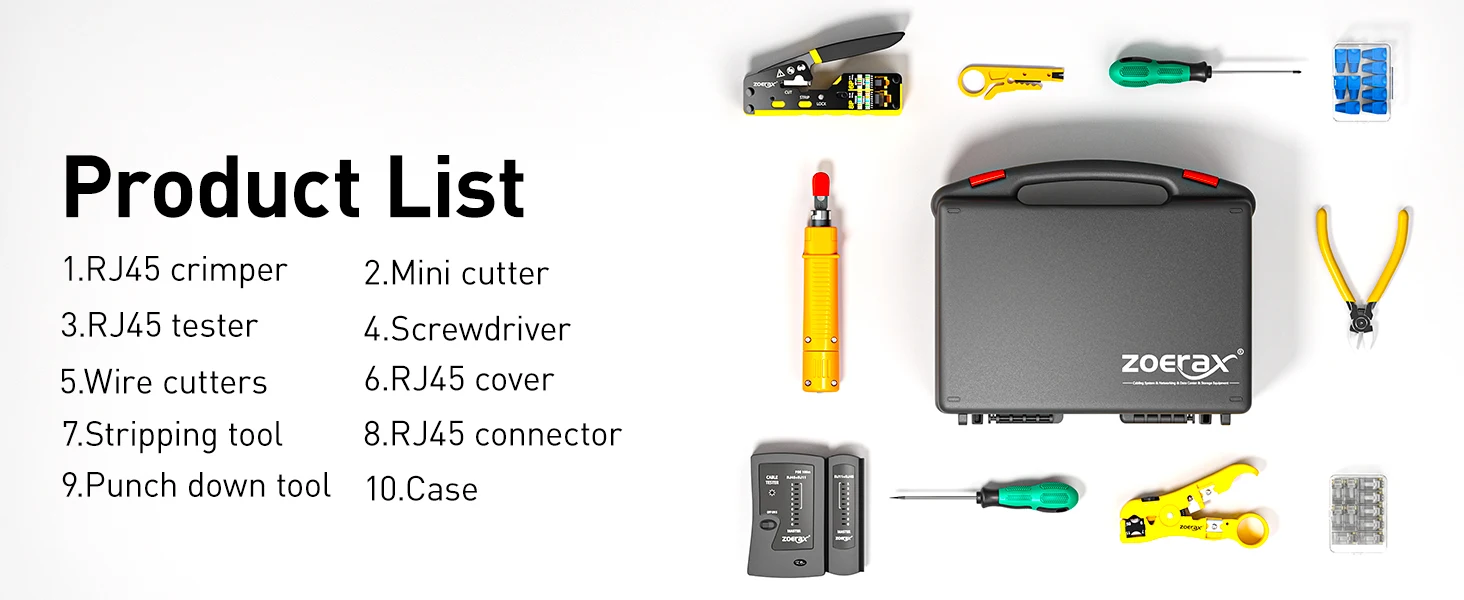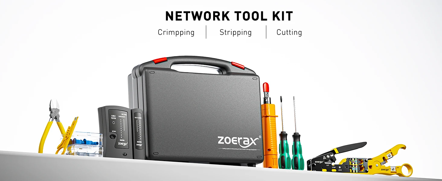 ZoeRax Kit de herramientas de red profesional, kit de herramientas de crimpado RJ45 12 en 1-Crimpadora de paso, probador RJ45, herramienta perforadora 110/88, pelador, cortador, conectores y botas de paso Cat6