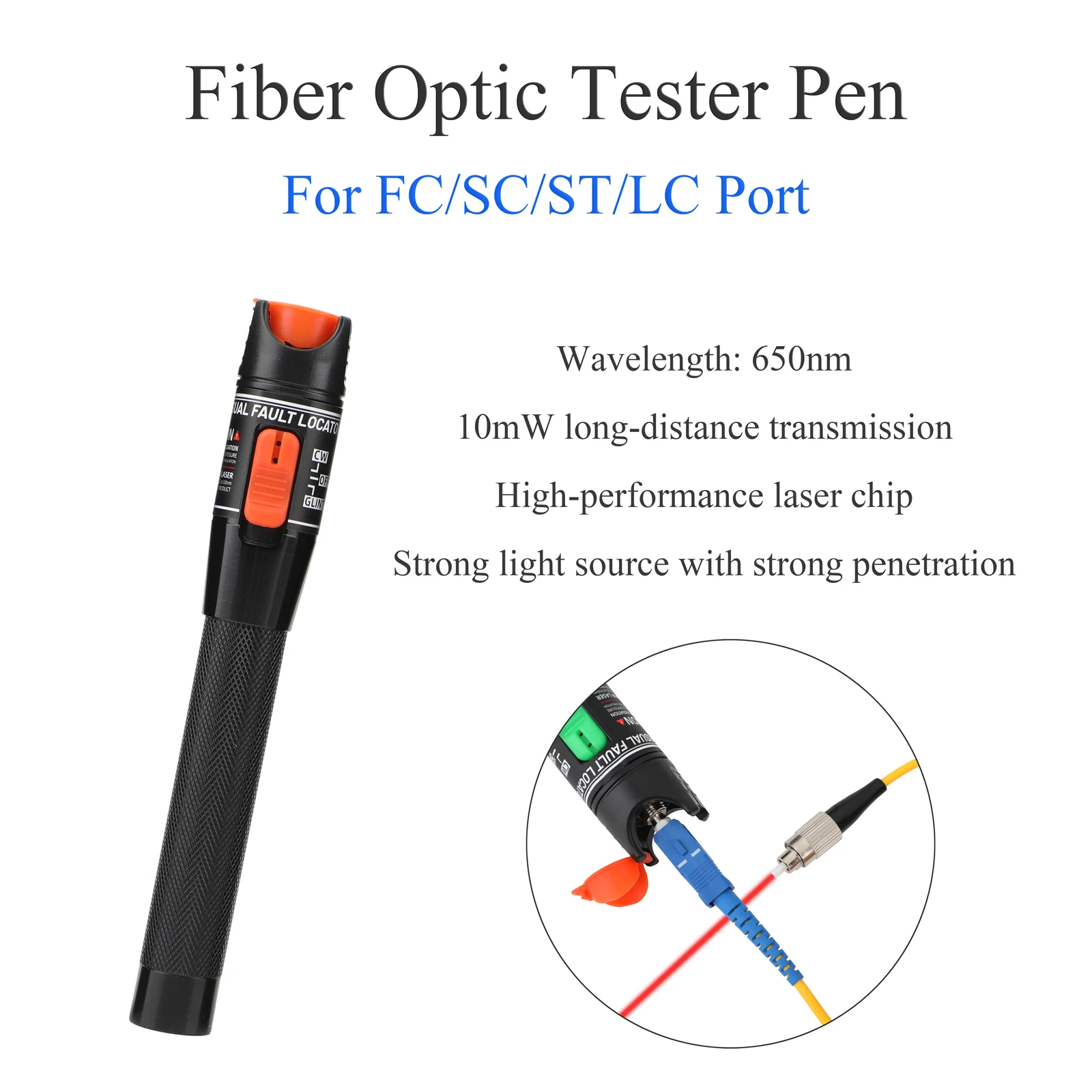 Rango de prueba: 10 KMLongitud de onda: 650 nmPuerto aplicable: FC/SC/STFuente de alimentación: baterías 18650 (no incluidas)8. 【Adaptador de fibra óptica】