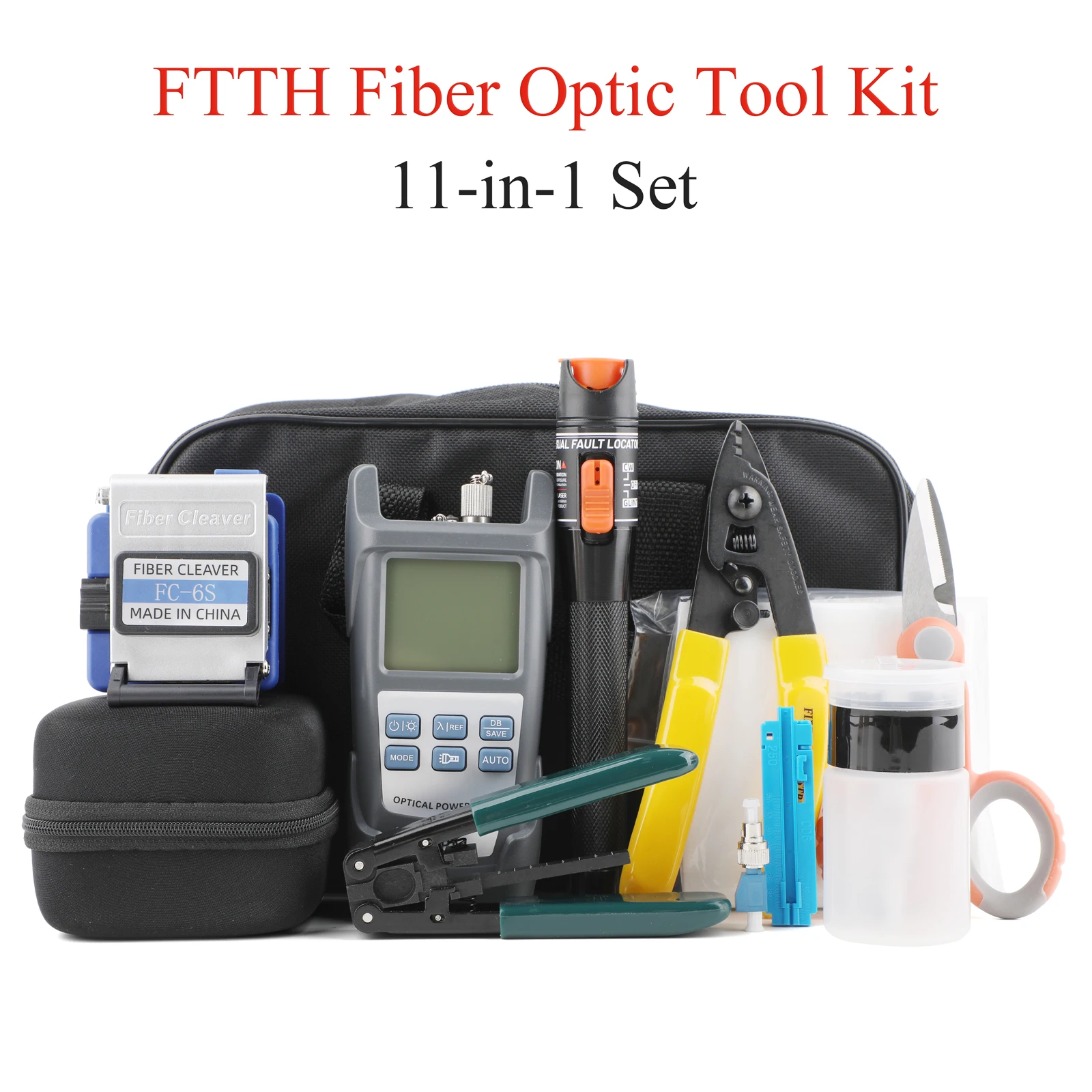 El kit de herramientas de terminación de fibra óptica (9/11 PCS en 1) incluye: cuchilla de fibra óptica, medidor de potencia óptica, herramientas de prueba y herramientas de limpieza para proyectos FTTH.Tipo de producto: Kit de herramientas de terminación de fibra óptica1. 【Cortador de fibra óptica】
