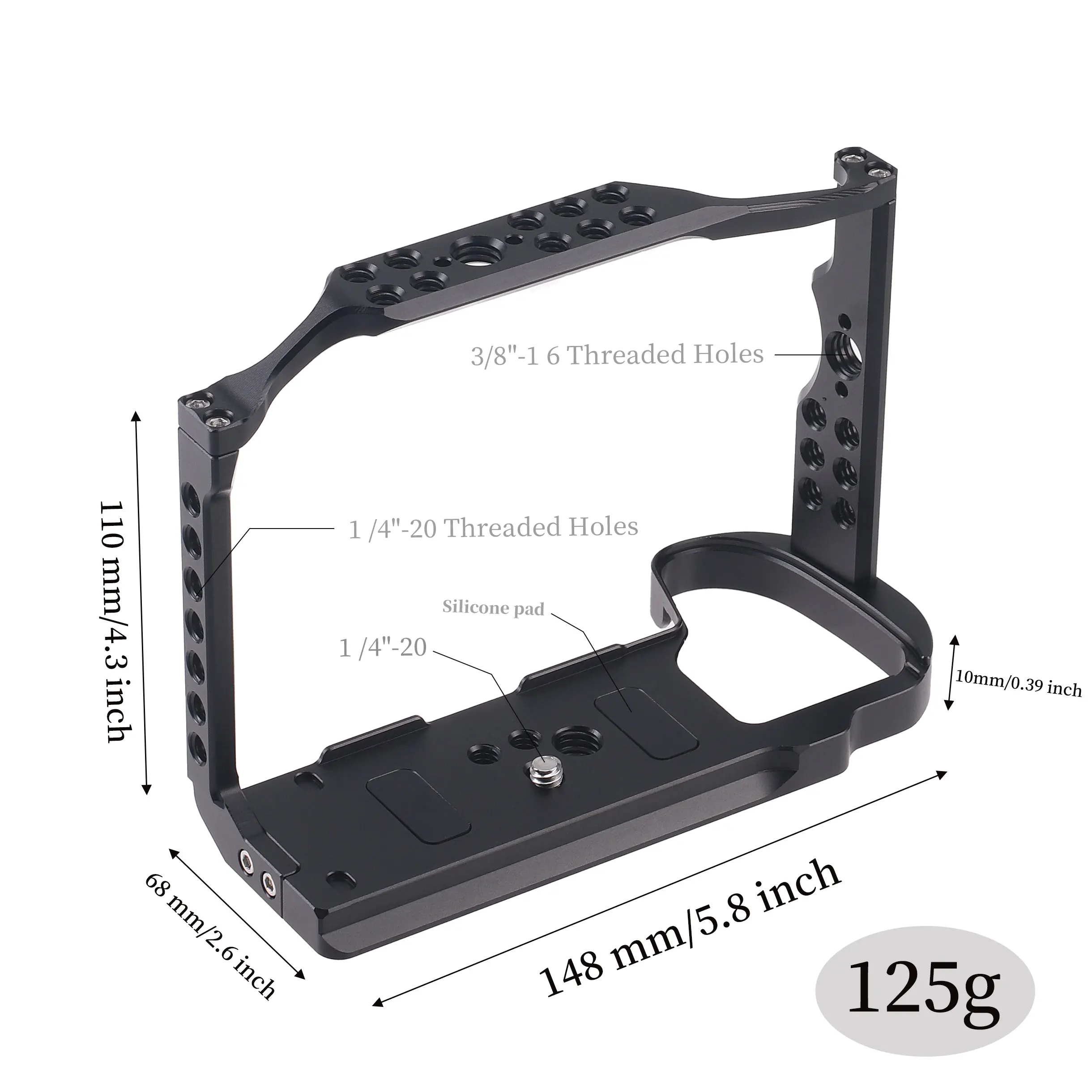 Descripción:La jaula de aluminio para cámara está diseñada específicamente para la cámara Fuji X-H2/X-H2S.Es una jaula completa que es liviana y se adapta perfectamente a la cámara.Está equipado con múltiples orificios roscados de 1/4" -20 y 3/8" -16, orificio de ubicación ARRl y zapata fría para montaje de accesorios.Características:1.Está fabricado en aluminio aeronáutico y mecanizado de precisión CNC.Es robusto y duradero, ligero y fácil de usar;2.Diseño de cavidad liviano, una gran cantidad de orificios roscados de 1/4" -20 y 3/8" -16, orificio de localización ARRl y un soporte de zapata fría incorporado para micrófono, luces LED o montaje del soporte del monitor.3.La parte inferior de la jaula tiene almohadillas antideslizantes y un diseño antideflexión para proteger la cámara contra rasguños y movimientos.También incorpora orificios para tornillos de 1/4" -20 en la parte inferior para fijar la cámara al trípode.4.La parte inferior tiene un estándar internacional deslizante de 38 mm de ancho para el diseño de placa estilo Arca, que se puede instalar rápidamente en una rótula de trípode compatible con Arca Swiss Standard.5.No bloquearía ningún botón ni interfaz de la cámara ni la instalación de la batería, y brindará diferentes posibilidades de bricolaje para la fijación de los accesorios de la cámara.Especificación:Material: aleación de aluminioTecnología de procesamiento: mecanizado CNCTratamiento superficial: AnodizadoTamaño: 148*110*68mm (largo x alto x ancho)Peso neto: 125gEl paquete incluye:Diferentes paquetes tienen diferentes listas de productos.
