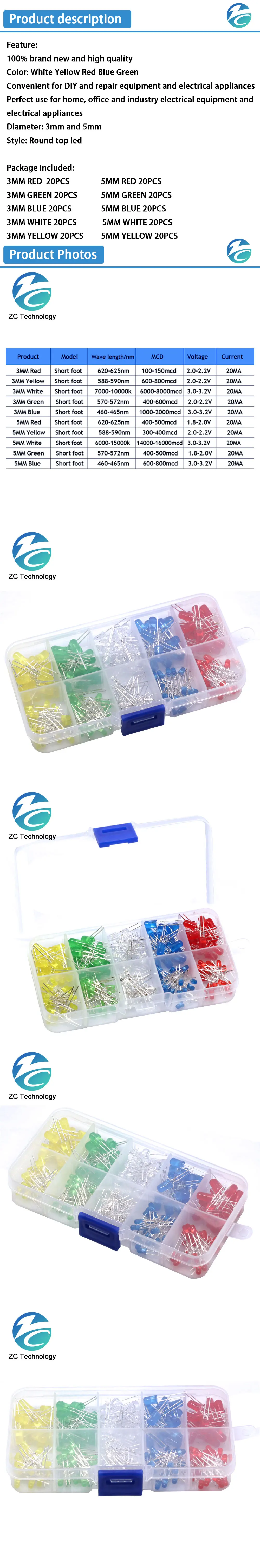 Kit de Led de 3MM y 5MM con caja, surtido de diodos emisores de luz de 5 colores, rojo, verde, amarillo, azul y blanco, 200 unids/lote, 20 unidades cada uno