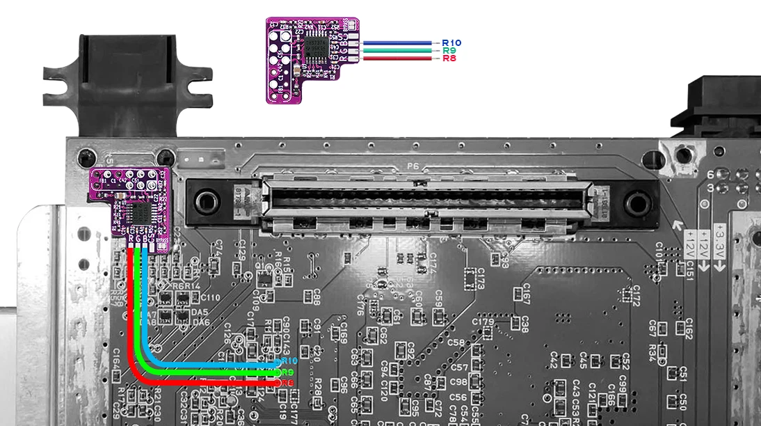 ATENCIÓNJersey 'Jbypass'El THS7374 tiene un filtro de paso bajo en cada uno de los cuatro canales que se puede activar cortocircuitando el puente 'bypass' en la placa de modificación. Esto es principalmente necesario si Conecta la consola directamente a un televisor de pantalla plana. No hay necesidad de filtro de paso bajo en dispositivos analógicos.Si usa un OSSC o un Framemeister, es mejor usar sus opciones de filtro.¡Esta modificación solo funciona con las revisiones de la placa principal del 03/04/02/!