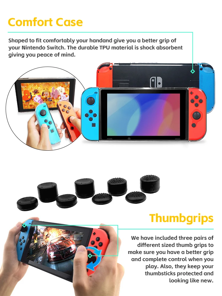 Diseñado para adaptarse cómodamente a tu mano y darte un mejor agarre de tu Nintendo Switch. El material duradero de TPU absorbe los golpes, lo que le brinda tranquilidad. Hemos incluido tres pares de agarres de pulgar de diferentes tamaños para asegurarse de tener un mejor agarre y un control completo cuando juega. Además, mantienen tus pulgares protegidos y parecen nuevos.