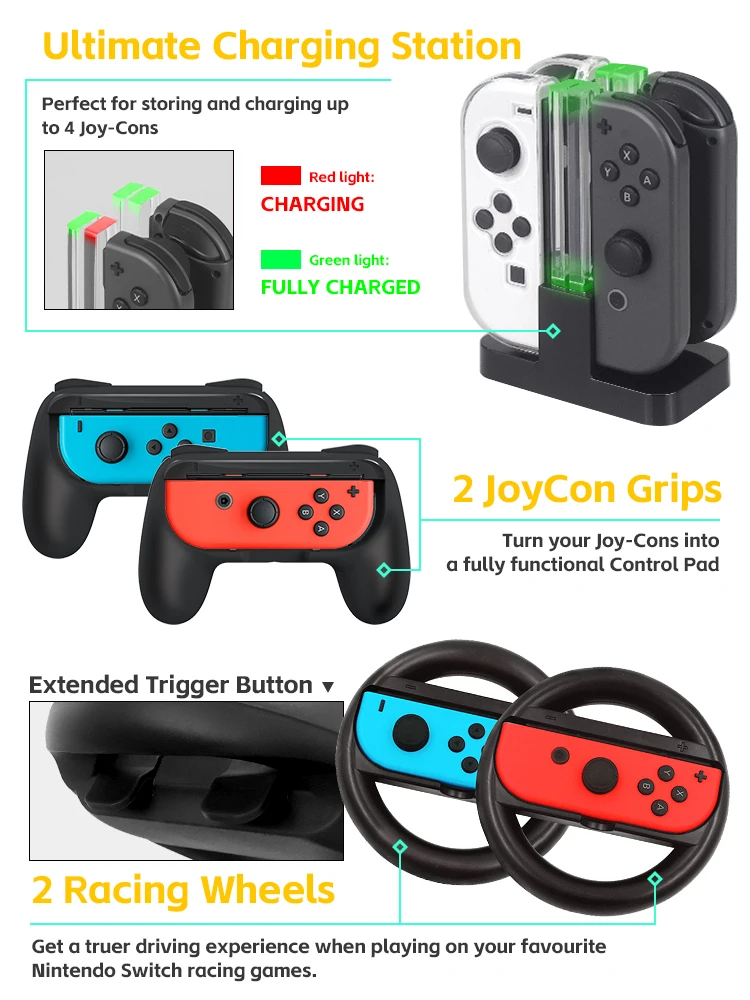2 empuñaduras JoyCon Convierte tus Joy-Cons en una almohadilla de control completamente funcional y 2 ruedas de carreras para obtener una experiencia de conducción más auténtica cuando juegues en tus juegos de carreras favoritos de Nintendo Switch.