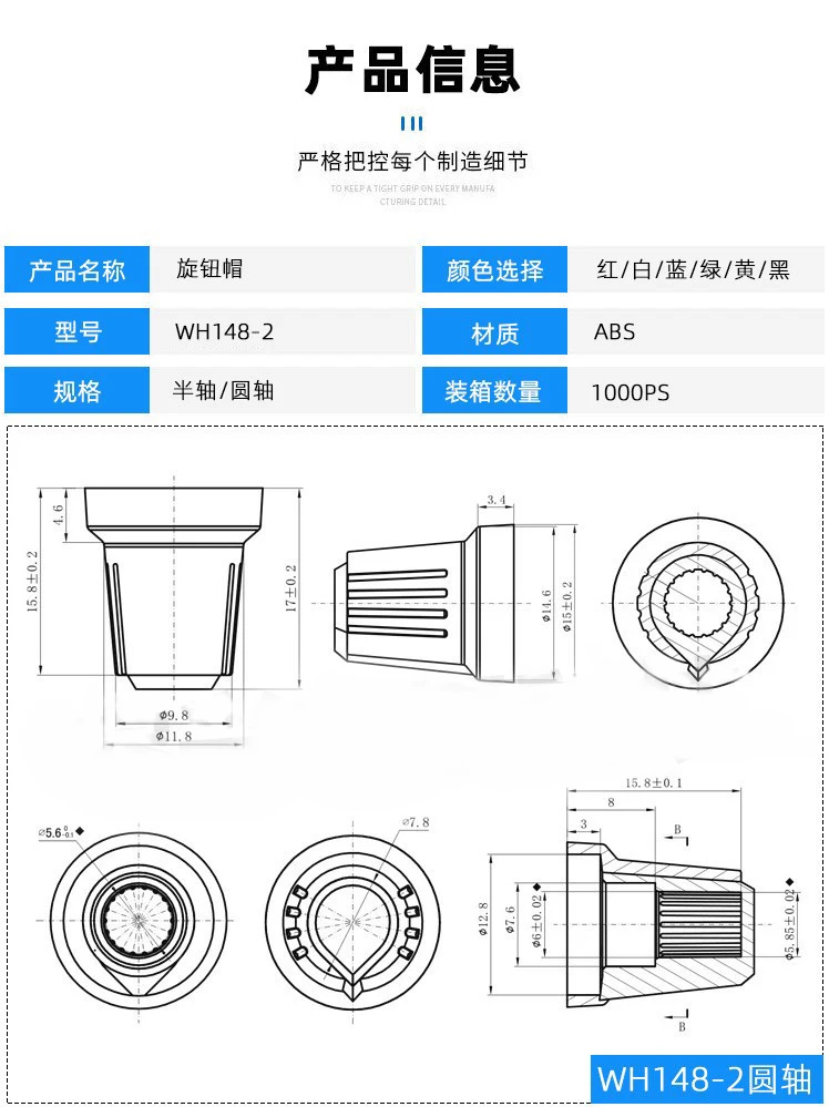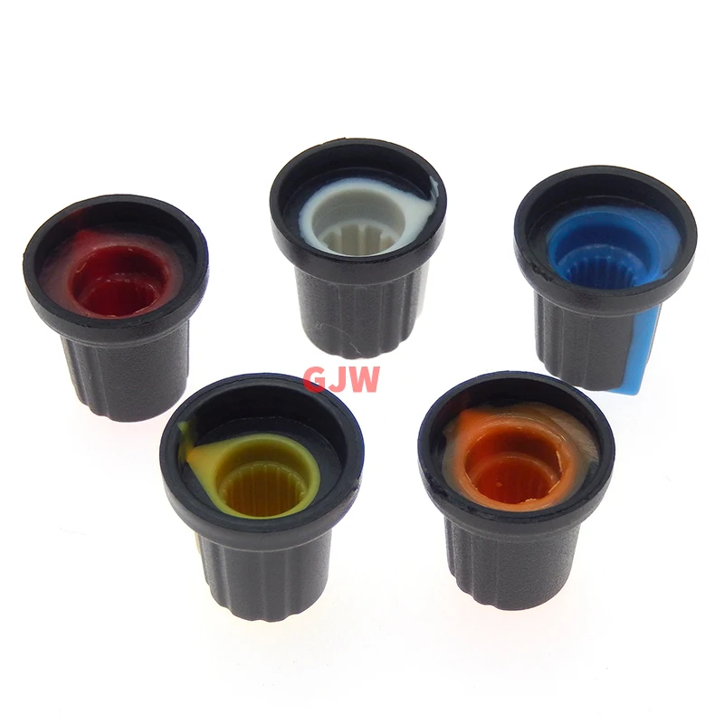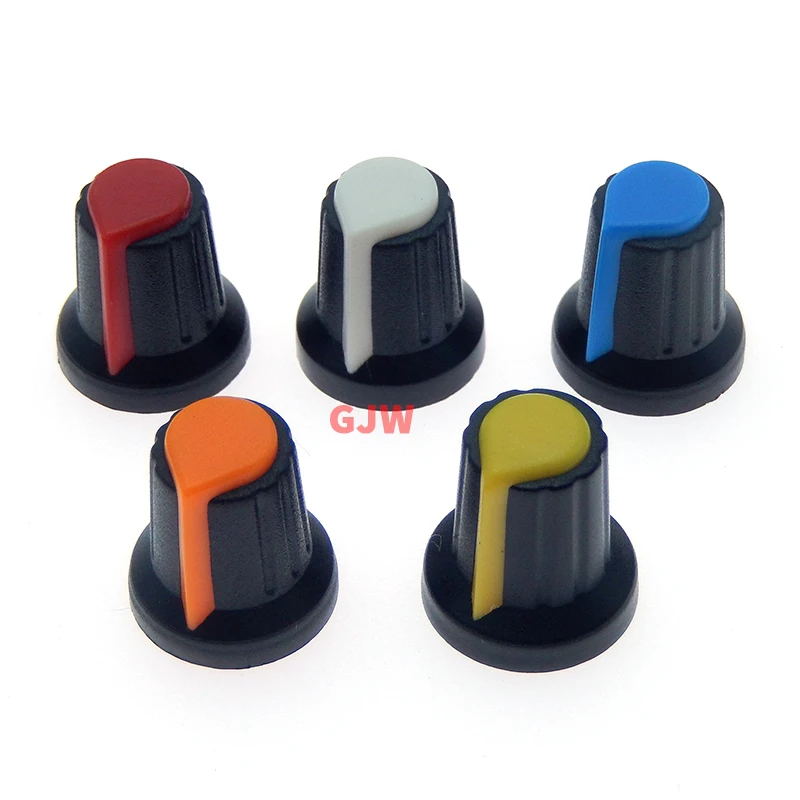 Comprar Kit de perilla de potenciómetro WH148, tapa de perillas de plástico, orificio de eje de 6mm, AG2, amarillo, naranja, azul, blanco, rojo, 5 valores x 5 piezas = 25 piezas, 25 piezas por lote
