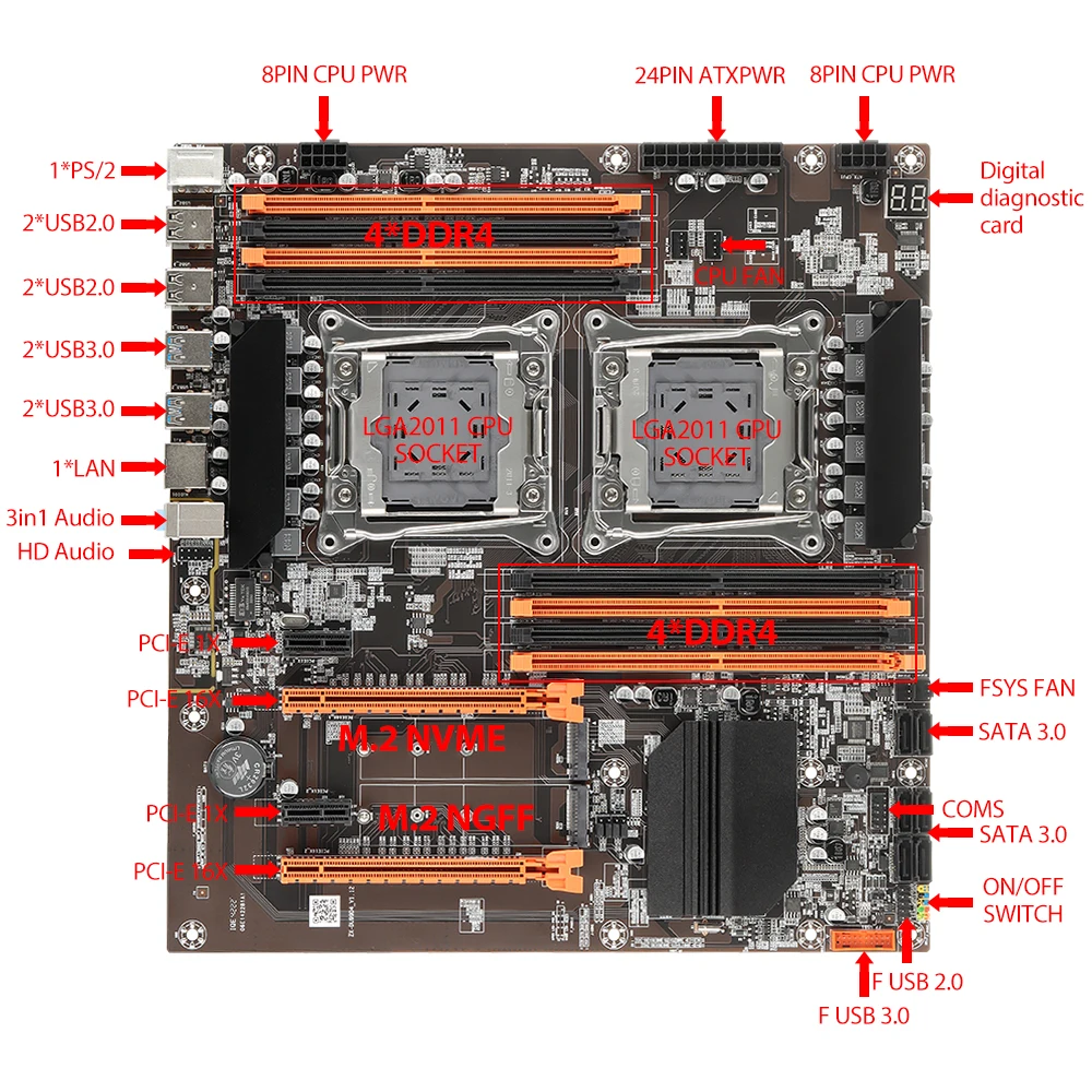 【Placa base + CPU + RAM】: Placa base X99 * 1 + E5 2699v3*2 + DDR4, 2400MHz, 16GB * 4, 1/2/2/1/2/2/3/2/2/16/4/4/4/16/16/6/6/2/2/5/6/6/2/6/6/6/6"