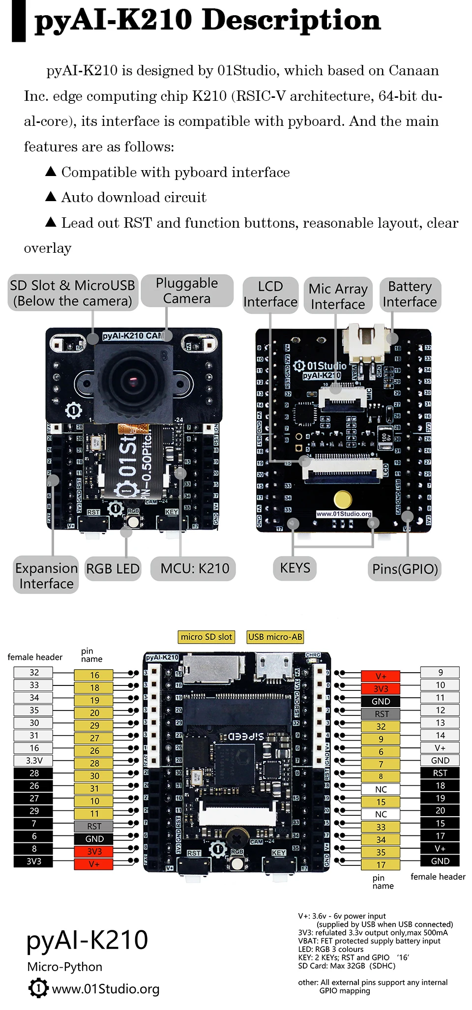 Kit de placa de desarrollo pyAI- K210 de estudio, pitón, Inteligencia Artificial AI, Visión de máquina, Micropython de aprendizaje profundo, 01