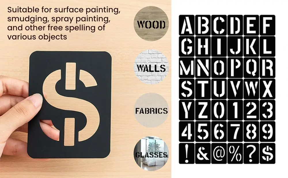 Incluye 26 plantillas de letras mayúsculas, 10 números y 6 símbolos para diversas necesidades artísticas.