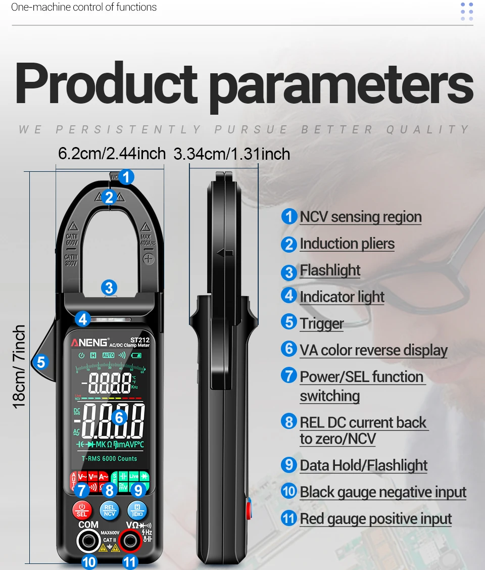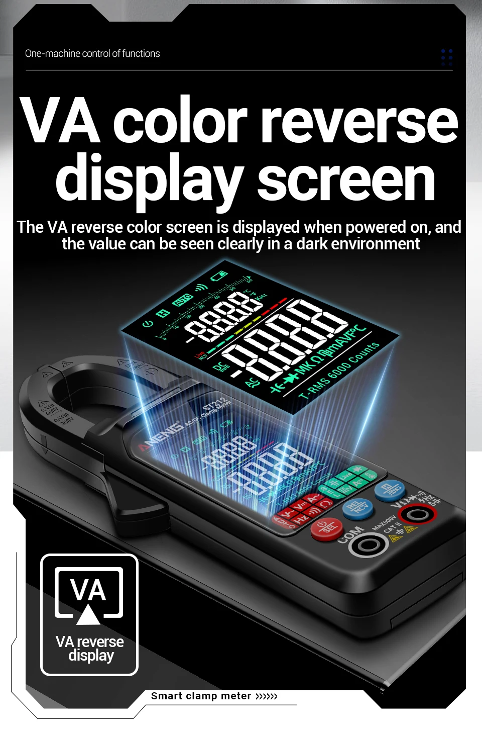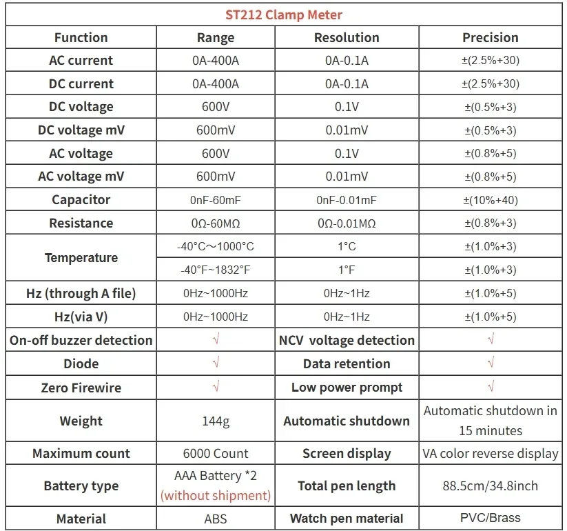 ANENG ST212, pinza amperimétrica digital, 6000 cuentas, 600 V CA/CC, 400 A, NCV, LCD retroiluminado, rango automático, multímetro de bolsillo, herramienta de prueba eléctrica, probador de continuidad, prueba de diodos, medidor de capacitancia, medidor de frecuencia, medición de temperatura, LED Antorcha, diseño duradero