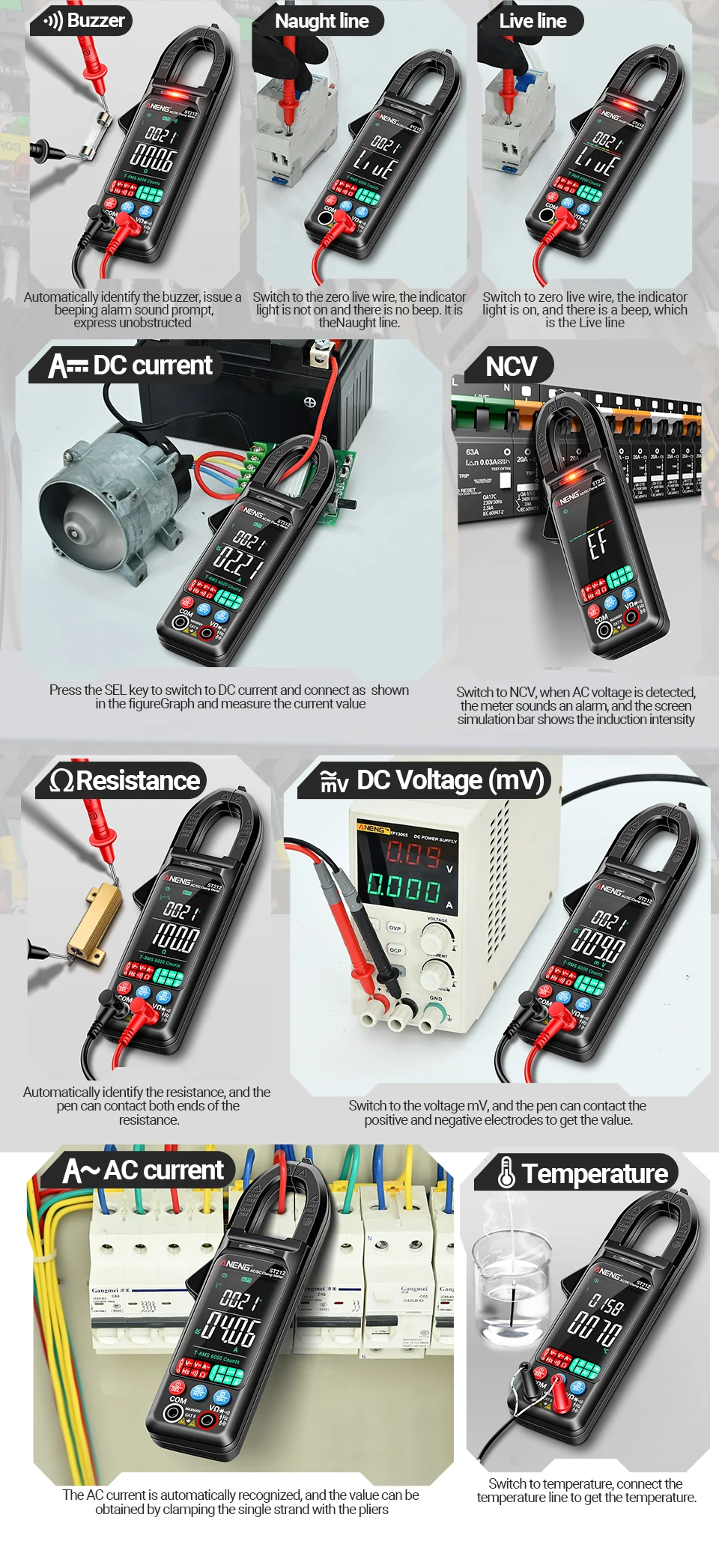 Probador eléctrico, verdadero RMS, rango automático, medición de corriente CA/CC, detección de voltaje sin contacto, pantalla retroiluminada, función de retención de datos, herramientas de electricista profesionales, herramientas eléctricas de bricolaje, multímetro portátil, medidor de alta precisión, pinza amperimétrica de bajo precio
