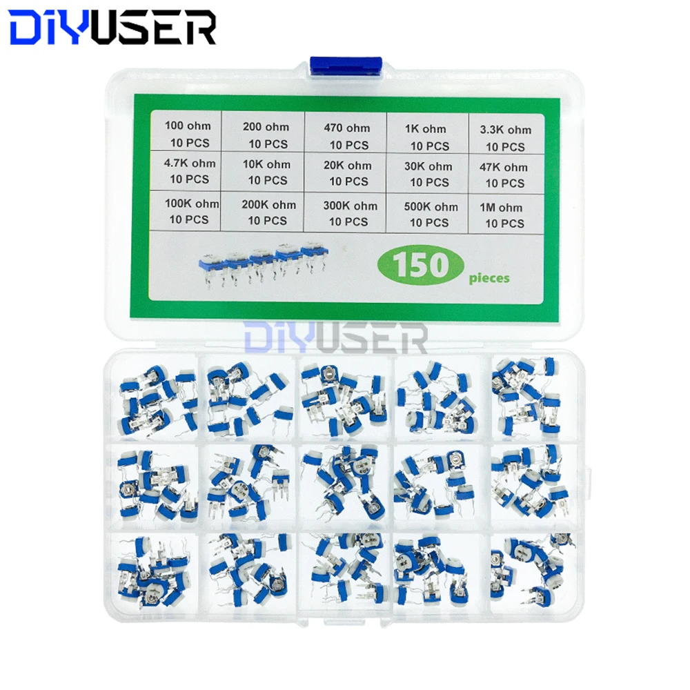 Kit de potenciómetro de recorte RM065, 150 Uds., surtido de resistencias variables de 15 valores con caja para reparación electrónica DIY