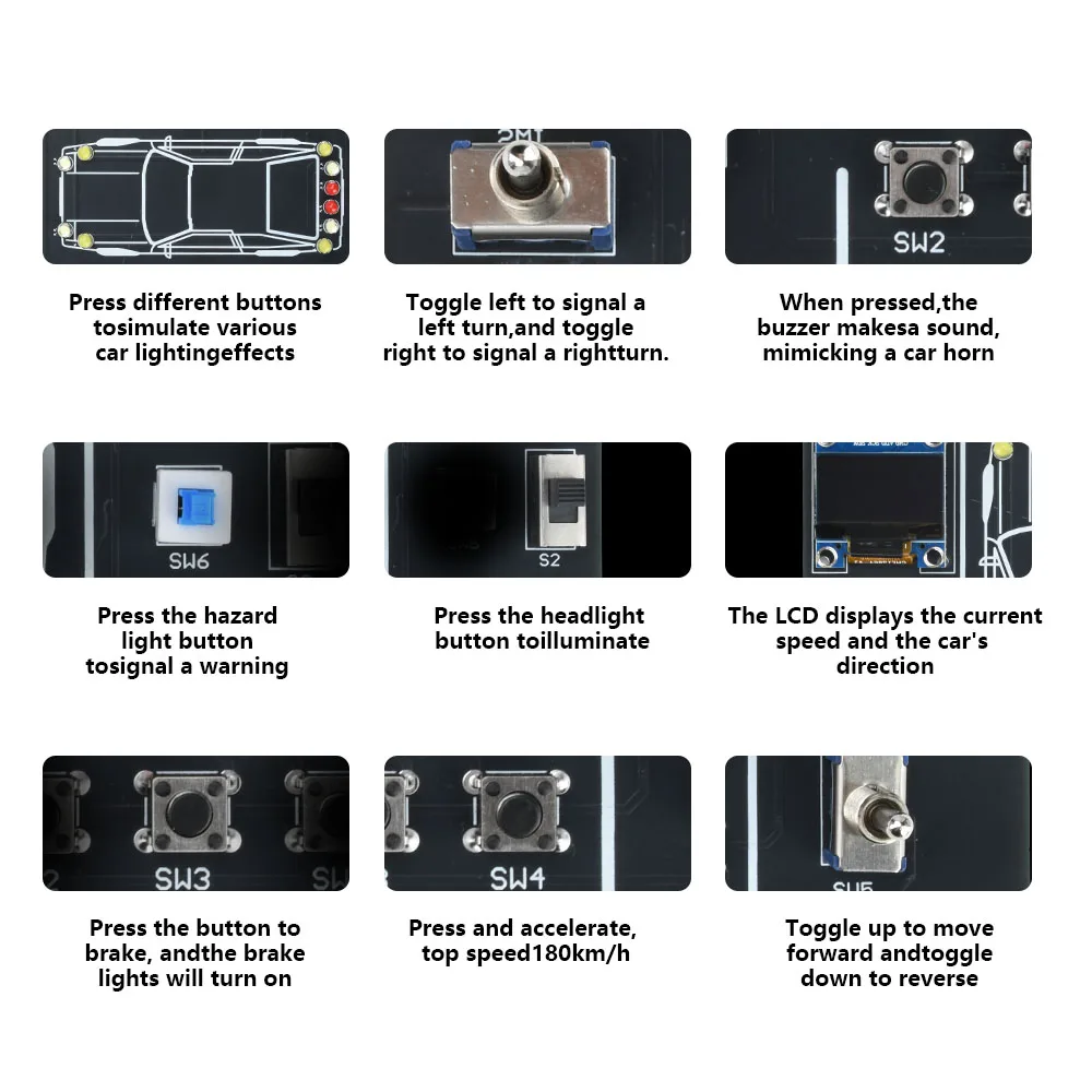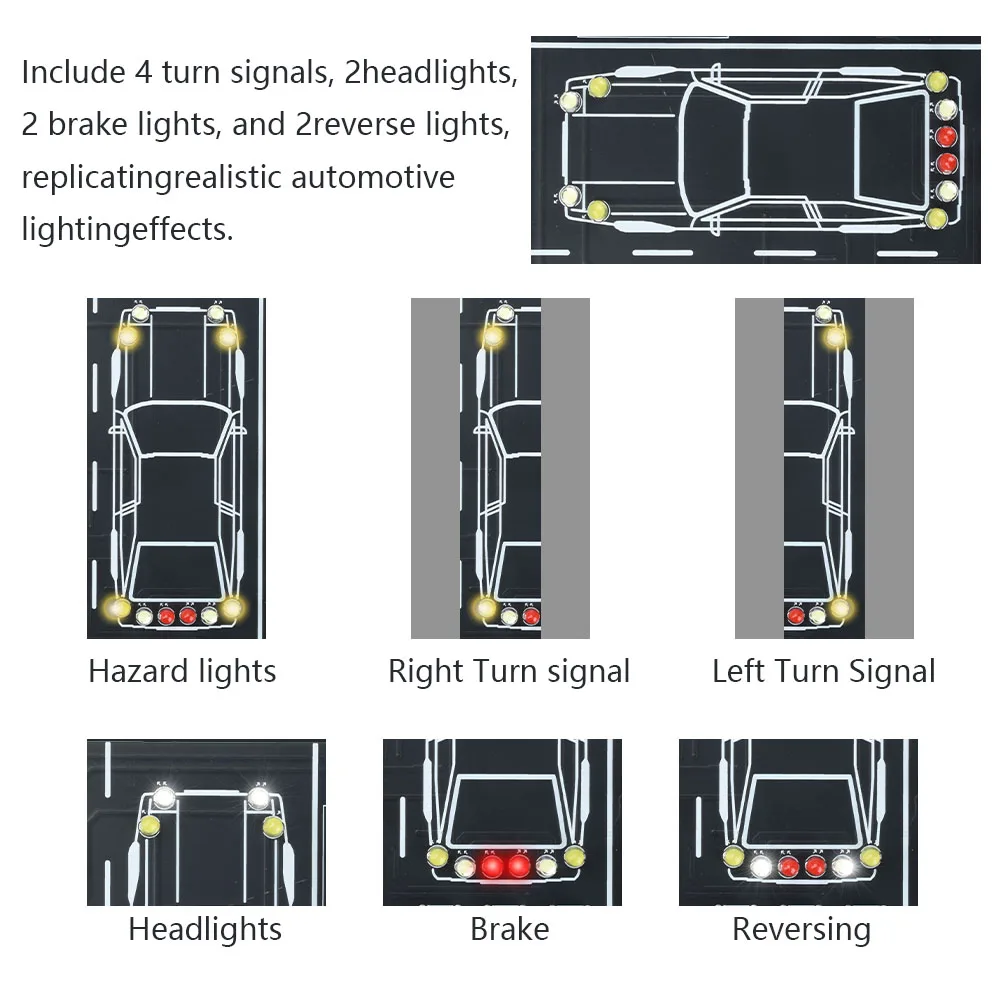 1. Simulación de funciones reales del automóvil: después de la fuente de alimentación, puede realizar las funciones de señales de giro izquierda y derecha, faros, luces de freno y luces de marcha atrás, y con la pantalla del velocímetro, reproduce en gran medida la experiencia operativa del automóvil.