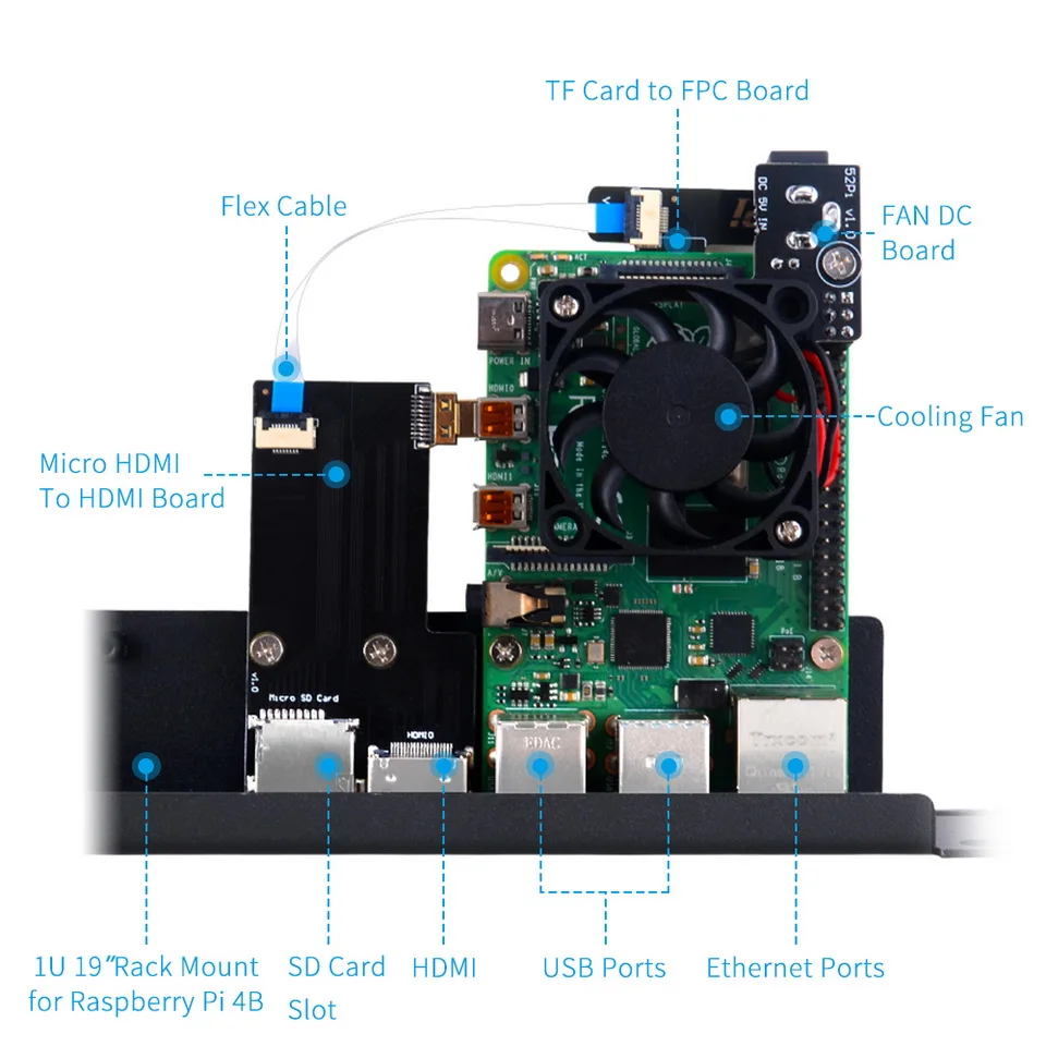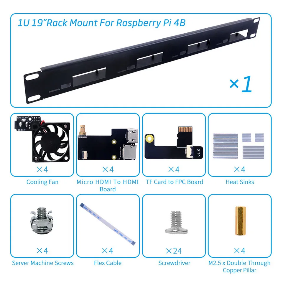 Kit de rack 1U para Raspberry Pi 4, montaje en rack de 19 ′′, hasta 4 unidades