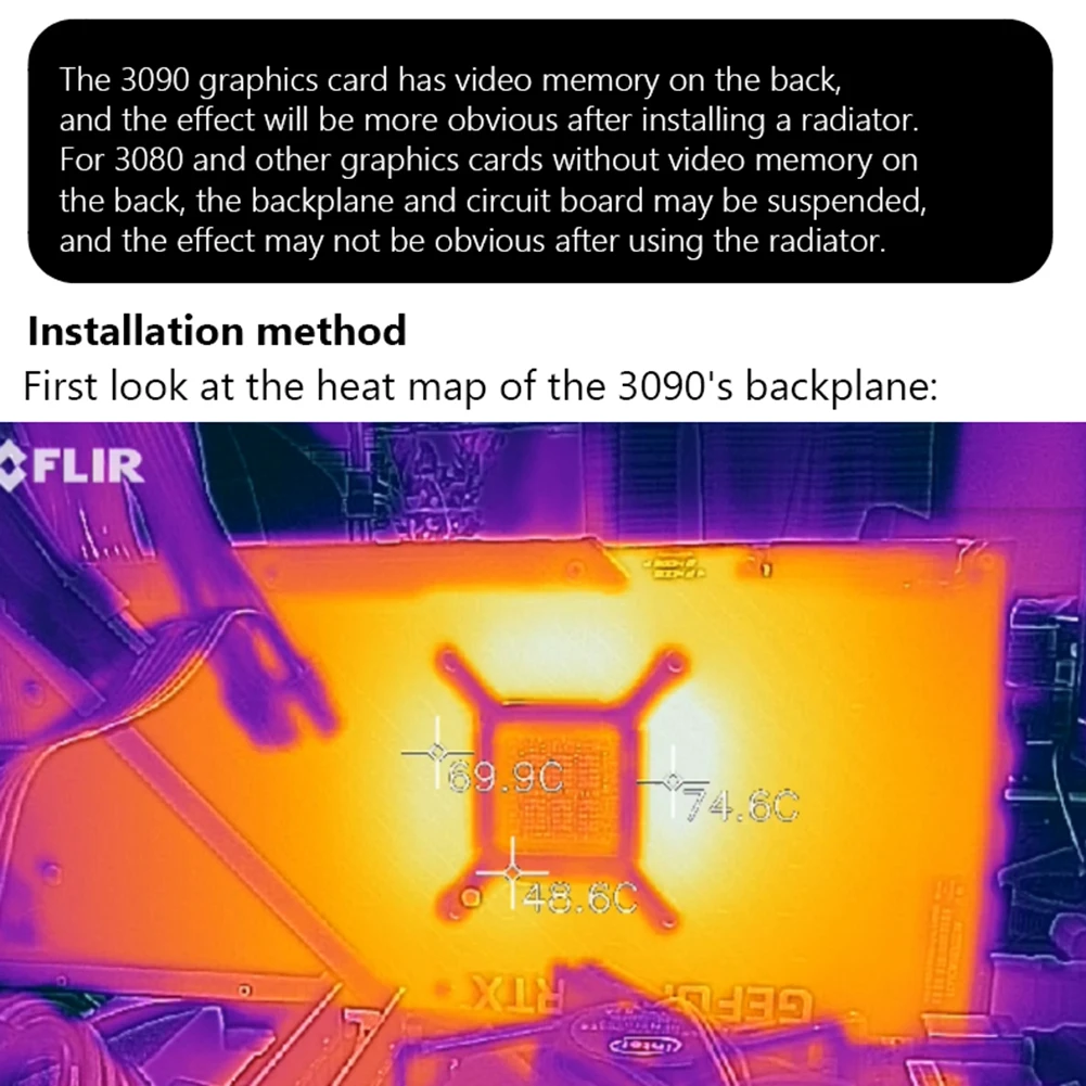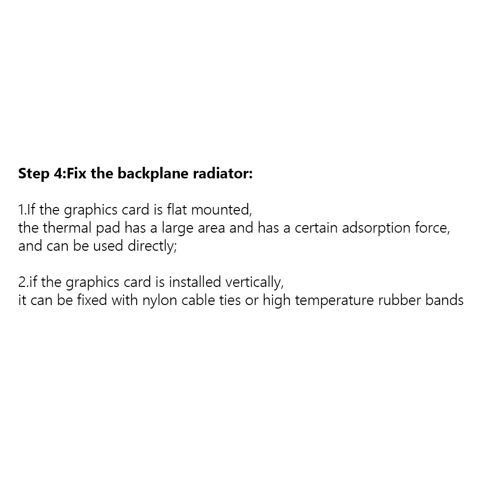 Paso 4: Fije el radiador de la placa posterior: Si la tarjeta gráfica está montada en plano, la almohadilla térmica tiene un área grande y tiene una cierta fuerza de adsorción, y se puede usar directamente; si la tarjeta gráfica se instala verticalmente, se puede fijar con bridas de nailon o bandas de goma de alta temperatura.
