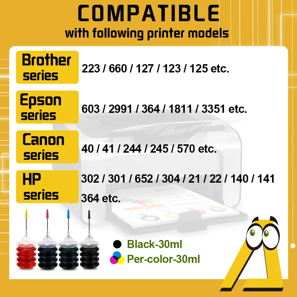 Tinta de tinte universal de 30ml, kit de recarga de tinta K C M Y para HP, Canon, Brother, Epson, Lexmark, cartucho de tinta de impresora
