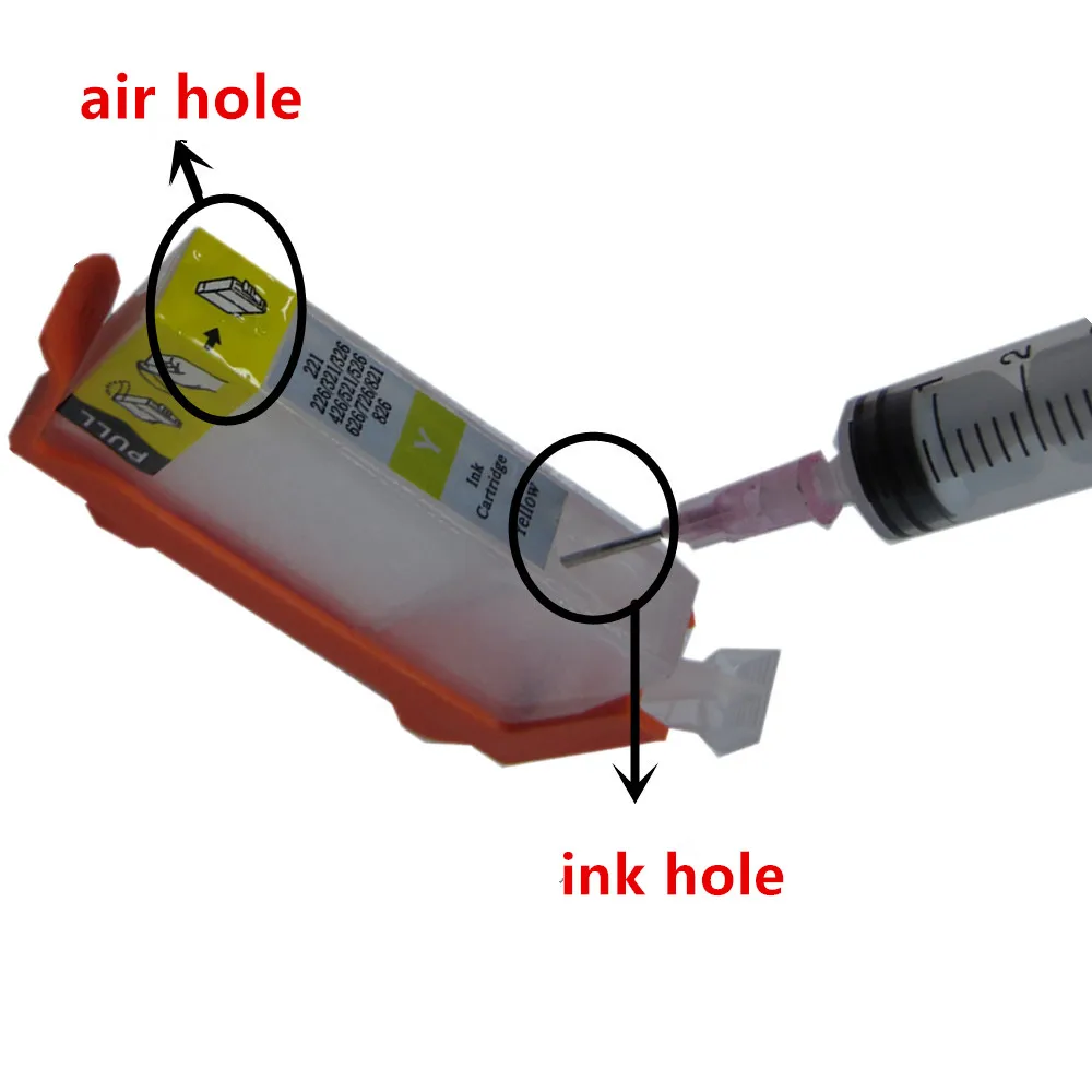 4.El orificio de recarga y el orificio de aire son diferentes. Saque el tapón de goma de aire amarillo cuando use el cartucho.