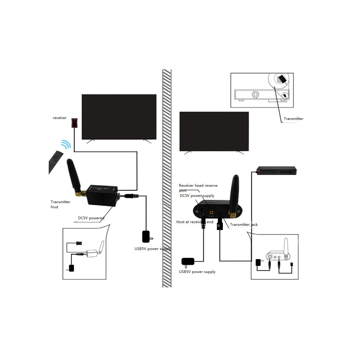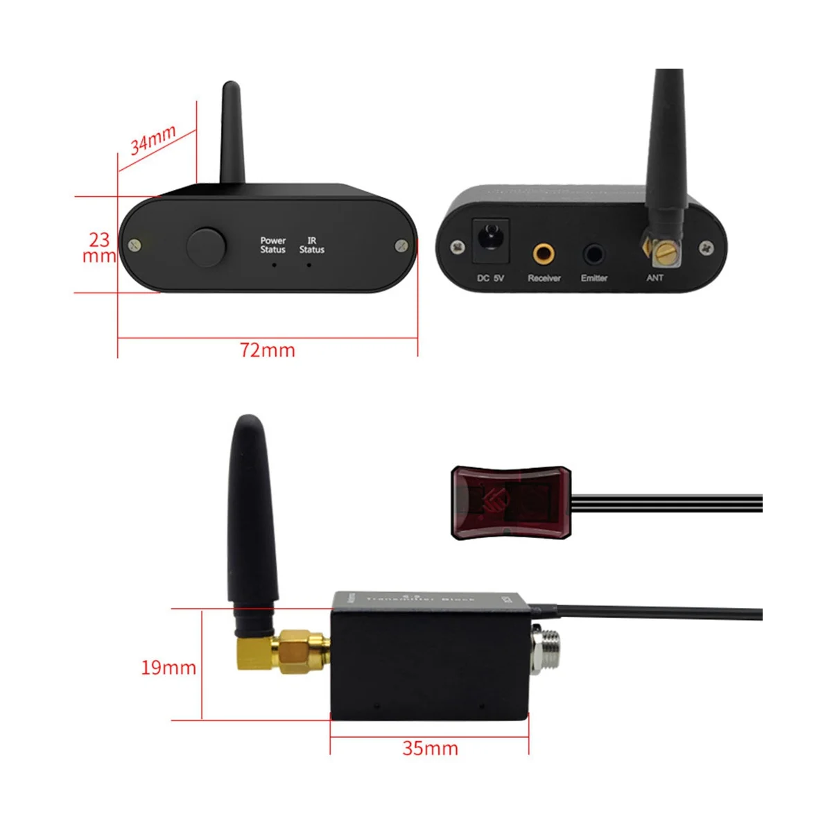 Recepción y transmisión infrarroja (RF) de frecuencia de largo alcance de 38 a 56 kHz; oculta la caja de cables (STB) y otros componentes A/V de forma inalámbrica usando casi cualquier control remoto; Distancia inalámbrica: hasta más de 100 pies. La distancia puede variar debido a los obstáculos. No se necesita línea de visión directa. Luz alta: fuerte antiinterferencia: se puede utilizar en un entorno de luz fluorescente; transmisión inalámbrica: no es necesario tirar del cable lejos; and play Plug: no es necesario instalar software; nueva tecnología de Chip: derivada de la tecnología de alta gama; fuerte compatibilidad: compatible con todo tipo de electrodomésticos de control remoto por infrarrojos; pequeño y hermoso: fácil de ocultar y más limpio; Reenvío inalámbrico por infrarrojos, rompe el límite de distancia espacial, sin cableado, sin demora. Ventaja: transmisión inalámbrica potente y más conveniente; fuerte antiinterferencia: Se puede utilizar en un entorno de luz fluorescente; Transmisión inalámbrica: No es necesario tirar del cable lejos; Plug and Play: No es necesario instalar software; Nueva tecnología de Chip: derivado de tecnología de alta gama; Fuerte compatibilidad: Compatible con todo tipo de electrodomésticos de control remoto por infrarrojos; Pequeño y hermoso: Fácil de ocultar y más limpio; Fácil de instalar, enchufar y jugar; La manguera puede obtener energía del puerto USB de los electrodomésticos o usar una fuente de alimentación USB de 5V Transmisión inalámbrica a través de la pared; Romper la limitación de distancia y espacio, transmisión inalámbrica de señales infrarrojas en varios entornos; Mini ligereza, Pequeño y mini no ocupa espacio, fácil de ocultar; 250 metros de transmisión de larga distancia, al aire libre es más de 250 metros, en interiores es más de 50 metros de transmisión de larga distancia, la transmisión estable de la señal de control remoto no influye en La superficie mate de aleación de aluminio, mano de obra fina, carcasa metálica completa antiinterferencias, resistente al desgaste antioxidante Y resistente a la corrosión; estado de funcionamiento de un vistazo, aviso de estado de encendido, aviso de reenvío de señal de conexión, visualización en tiempo real, control remoto inalámbrico de múltiples electrodomésticos en diferentes lugares, admite un host receptor para conectarse a múltiples hosts de lanzamiento, o múltiples hosts de lanzamiento para conectarse a un host receptor, para lograr Control remoto inalámbrico en tiempo real sin demora Parámetros del producto Con enchufe, voltaje 100-204V Tipo de enchufe: enchufe de EE. UU., se aplica a Canadá, India, México, Tailandia, Taiwán, estados Unidos, Filipinas, etc. Frecuencia de transmisión: 433,92 MHz ± 200kHz Frecuencia de recepción: 34-60kHz; Frecuencia de emisión: 38kHz; Consumo de energía: DC 5V 500mAh; Distancia Remota: superior a 7m; distancia de transmisión: Más de 30m Más de 100m; Estilo: E1: Control de un electrodoméstico Color: negro Material: plástico Contenido del paquete: 1 x Kit de repetidor IR inalámbrico Solo el contenido del paquete anterior, otros productos no están incluidos. Nota: El reflejo de la luz y las diferentes pantallas pueden hacer que el color del elemento en la imagen sea un poco diferente del real. El error de medición permitido es +/- 1-3cm.