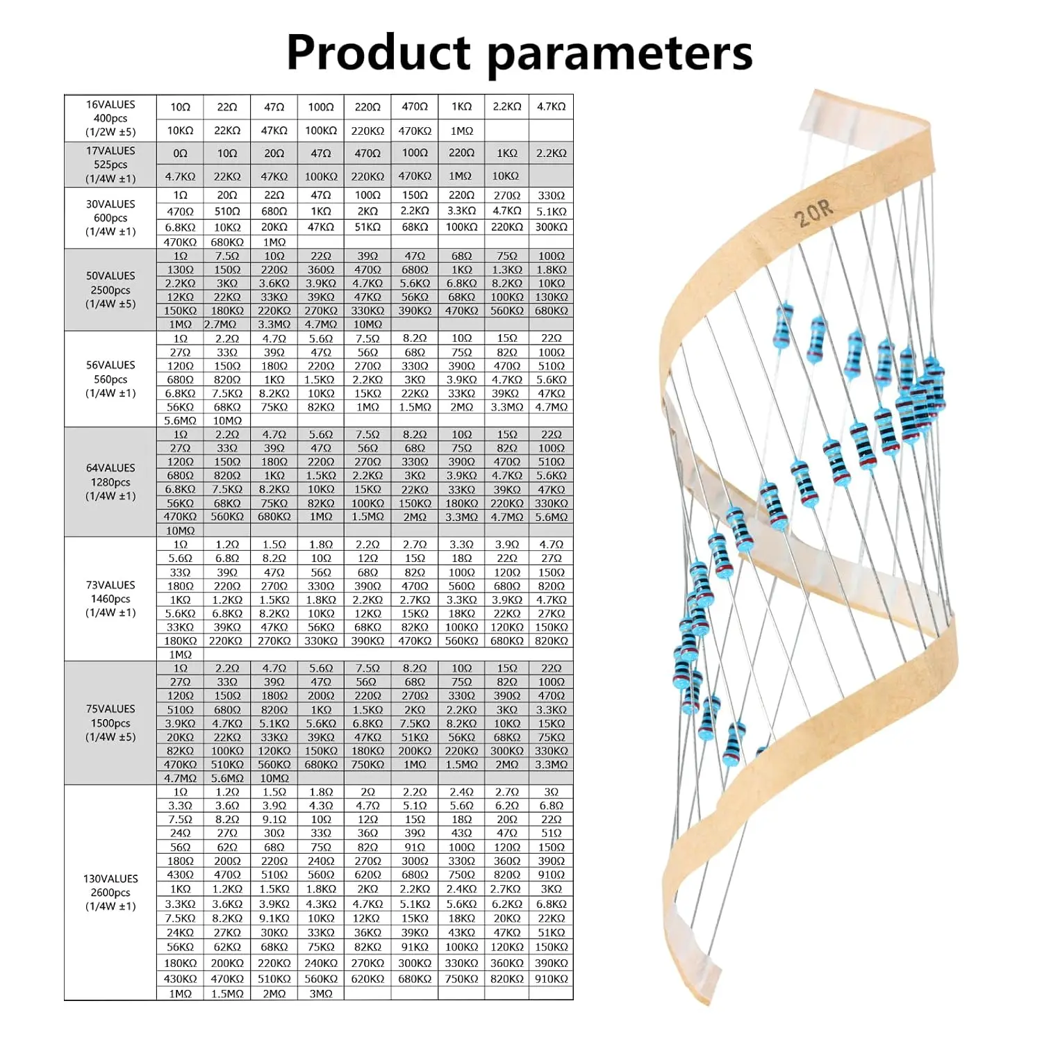 • Kit de resistencias :Este kit de resistencias incluye una amplia gama de resistencias de 10 ohmos a 1MOhm, proporcionando una cobertura completa para sus necesidades electrónicas.