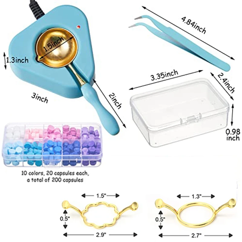 Juego completo de fusión de cera: Hay 1 calentador de sellado de cera eléctrico, 1 cuchara de cera, 1 caja (200 piezas) de 10 colores diferentes de cuentas de cera selladas y 1 caja de plástico, 1 pinza, 1 molde de sellado de cera circular, 1 molde de sellado de cera en forma de flor, Y 1 caja transparente para almacenar moldes dentro del paquete, con un total de 207 piezas. El montaje se completa para satisfacer sus necesidades de sellado de sobres