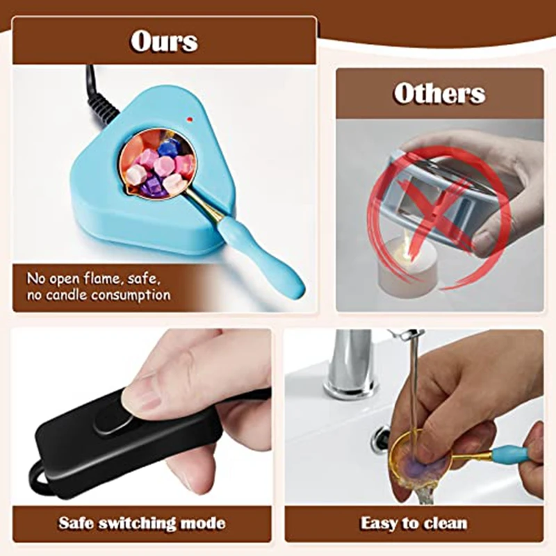 Seguro de usar: Este calentador de sello de cera eléctrico no necesita fuego, por lo que es seguro para los principiantes, simplemente conéctelo para jugar, rápido de derretir, conveniente de llevar y fácil de limpiar; nota: Los niños deben estar acompañados por adultos, Y está prohibido tocar directamente con sus manos al calentar, y apagar a tiempo después de su uso