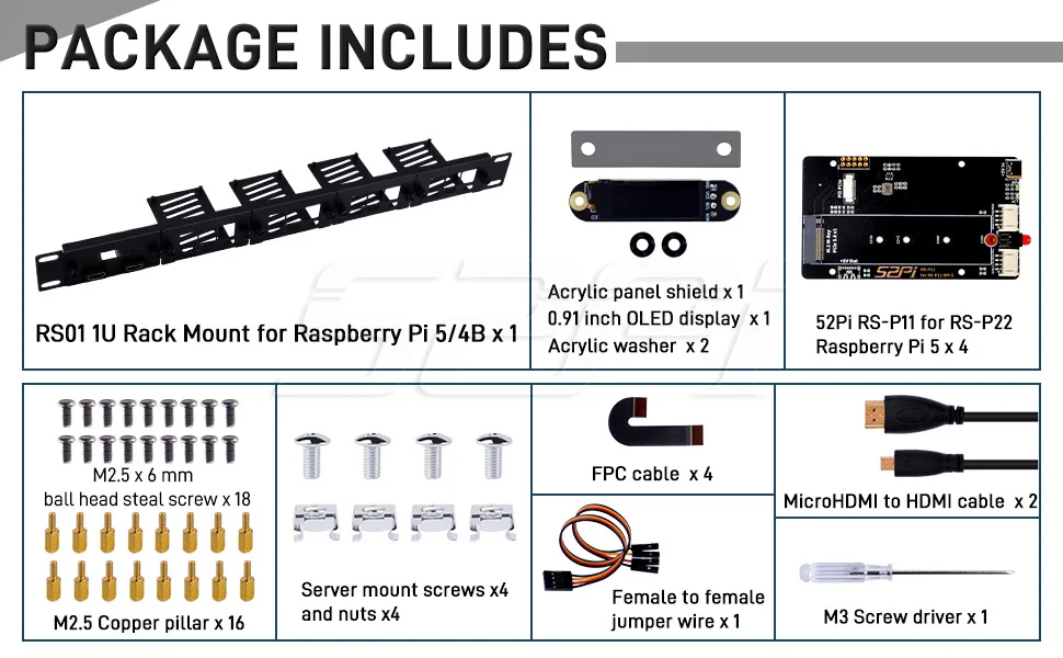 El soporte Rack admite la conexión de hasta cinco dispositivos Raspberry Pi y también se puede configurar con un marco de pantalla OLED en lugar de una de las ranuras Raspberry Pi.Estos componentes se pueden ajustar y quitar fácilmente gracias al uso de tornillos apretados a mano.La pantalla OLED cuenta con una pantalla de 0,91 pulgadas y se comunica con Raspberry Pi a través del protocolo I2C, lo que muestra información en tiempo real como el estado de la CPU, el estado de la memoria, la información IP y los números de serie.El contenido mostrado en el OLED se puede personalizar completamente.