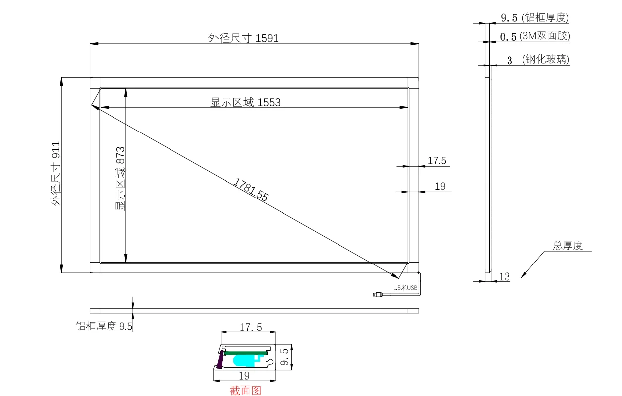 70 pulgadas 10 puntos IR multi pantalla táctil dimensiones del producto dibujo: